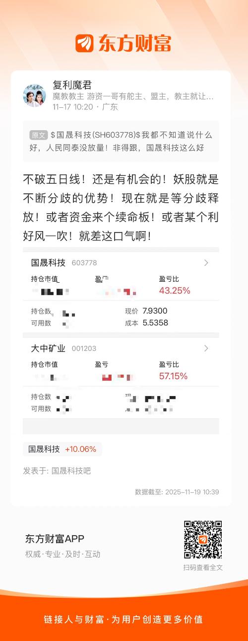 不破五日线!还是有机会的!妖股就是不断分歧的优势!现在就是等分歧释放!或者资金来个续命板!或者某个利好风一吹!就差这口气啊!