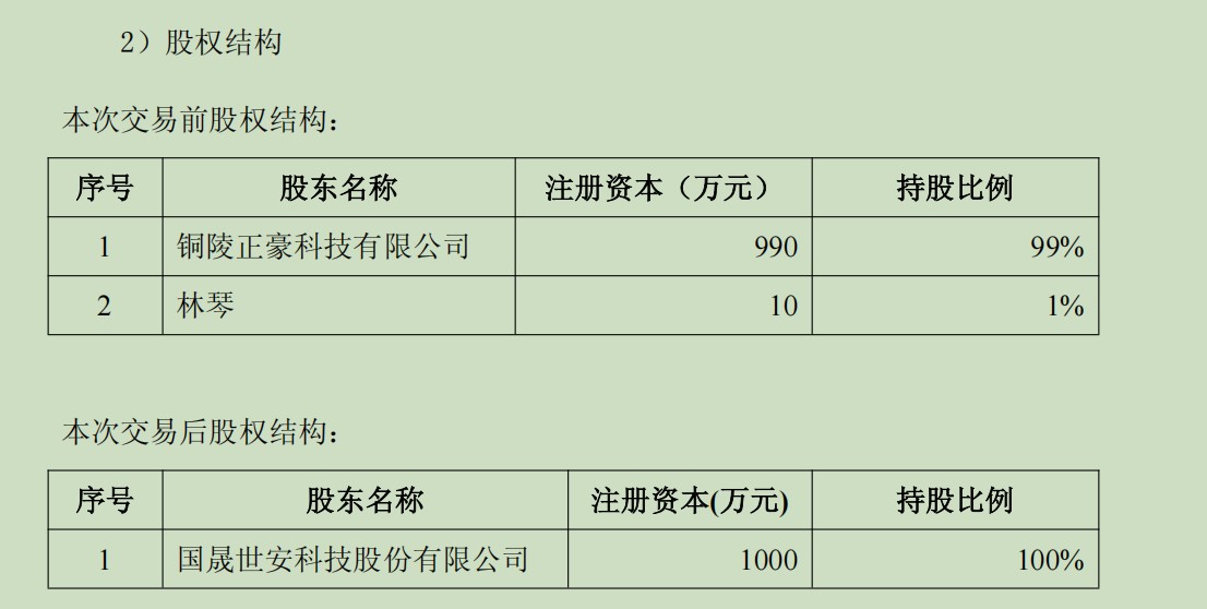 公告显示,国晟科技拟与铜陵正豪科技有限公司(下称“正豪科技”)及自然人林琴签署协议,以2.41亿元受让二者持有的孚悦科技100%股权。交易完成后,孚悦科技将成为国晟科技的全资子公司,并纳入合并报表范围。