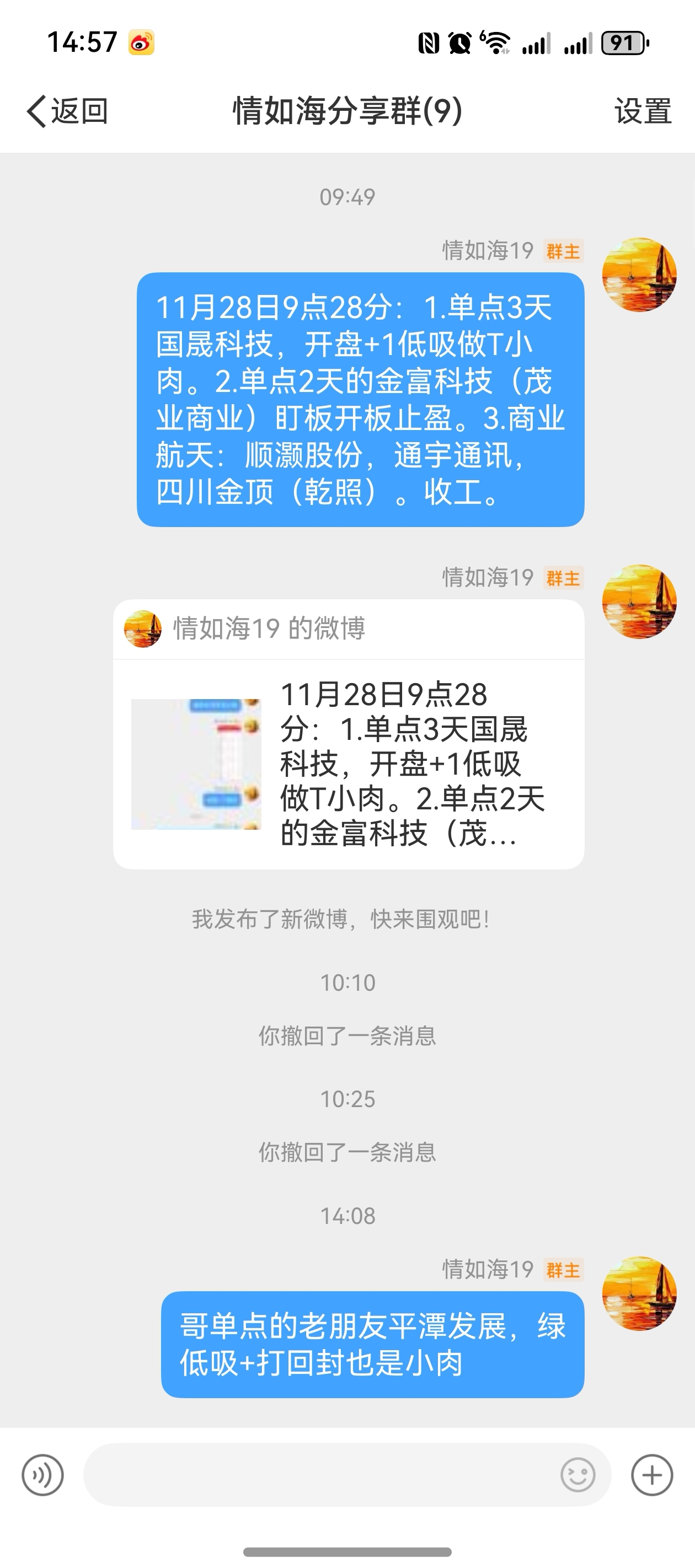 $国晟科技(SH603778)$ 11月28日9点28分:1.单点3天国晟科技,开盘+1低吸做T小肉。2.单点2天的金富科技(茂业商业)盯板开板止盈。3.商业航天:顺灏股份,通宇通讯,四川金顶(乾照)。哥单点的老朋友平潭发展,绿低吸+打回封也是小肉。收工。
