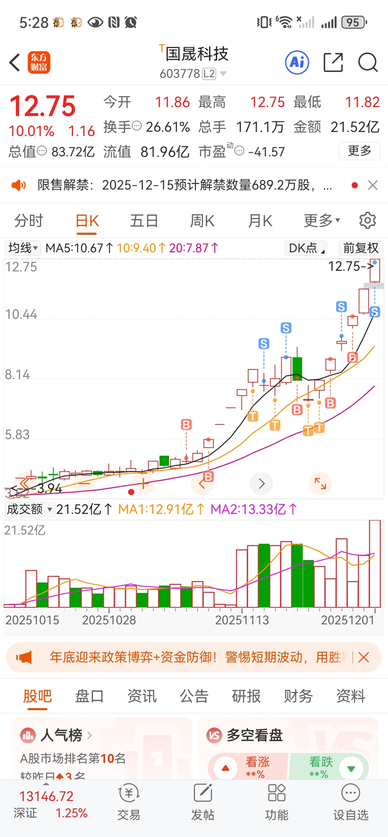 今年有幸参与了一把龙头。就是仓位少。我就是一个小散户,他涨的让我太害怕了。根本拿