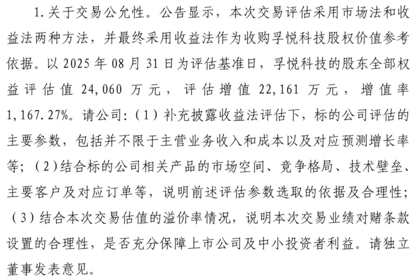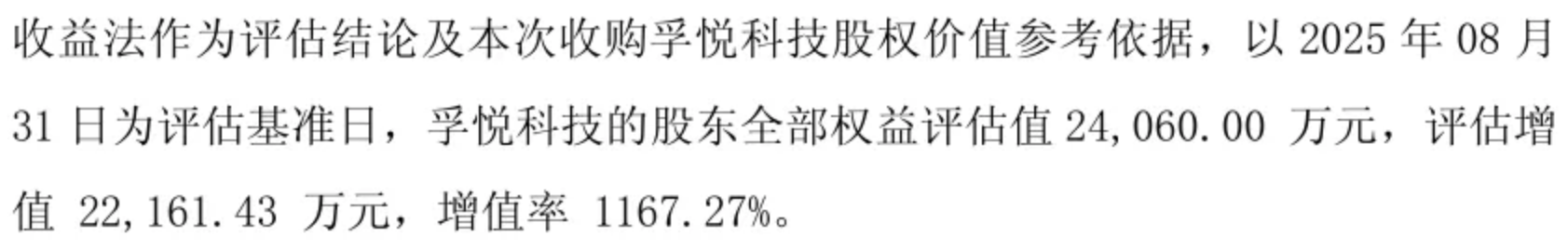 收购标的孚悦科技账面净资产为1899万元,评估值却高达2.41亿元,增值部分超过2.2亿元,评估增值率高达1167.27%。评估采用收益法,预计其2026-2028年扣非净利润将达到2000万、3000万、4000万元,三年增长曲线呈阶梯式跳升。