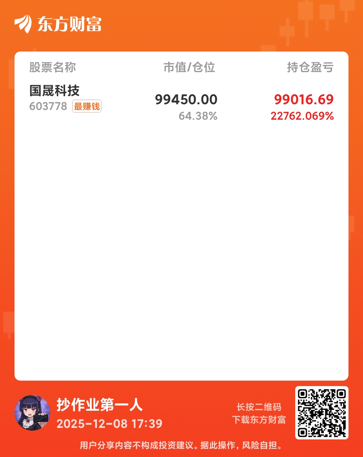 $国晟科技(SH603778)$ 好控,挂机陪你慢慢玩,持仓拿住利润部分,剩下的想t就t,长情一把