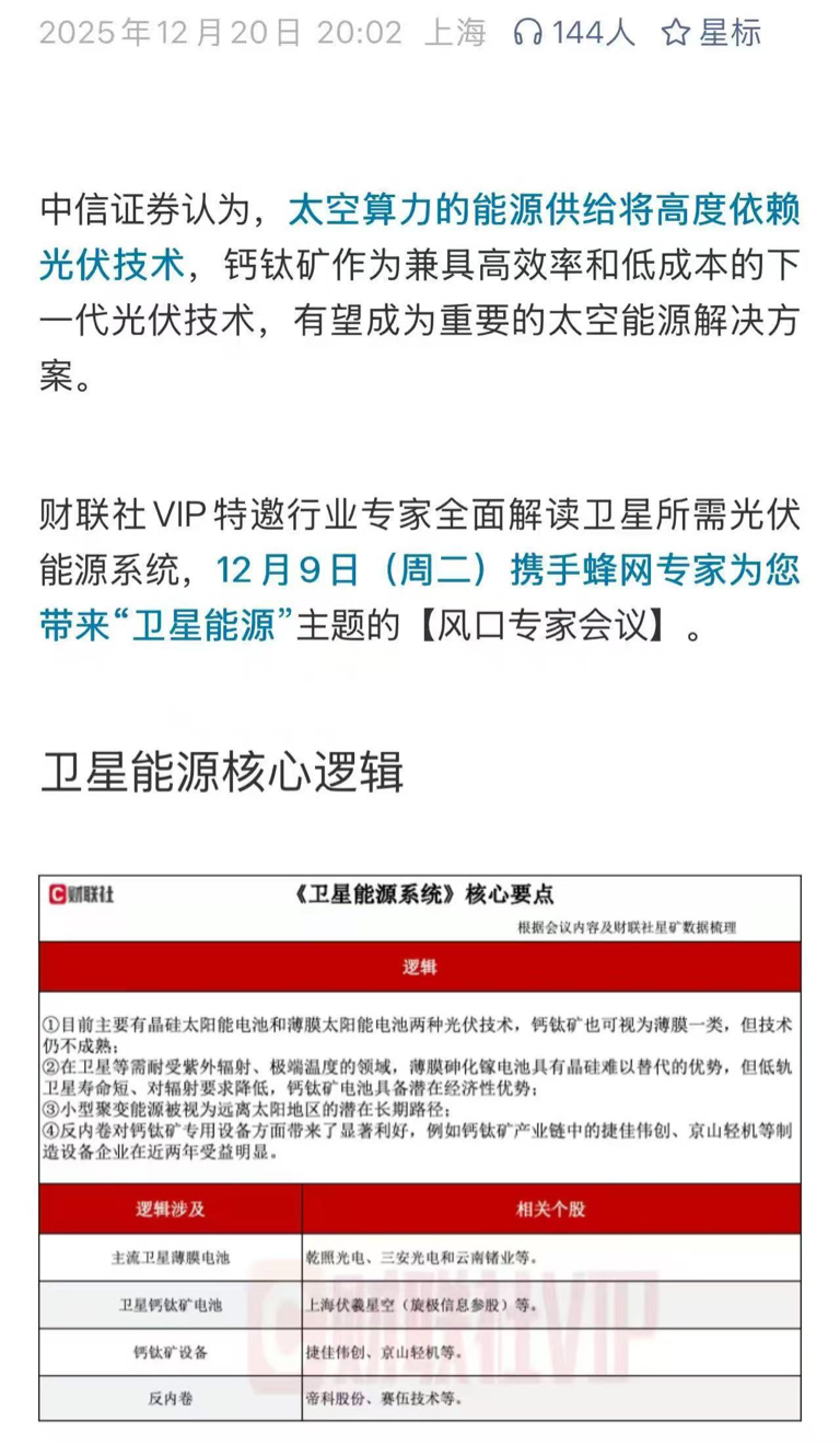 中信证券认为,太空算力的能源供给将高度依赖光伏技术,钙钛矿作为兼具高效率和低成本的下一代光伏技术,有望成为重要的太空能源解决方案