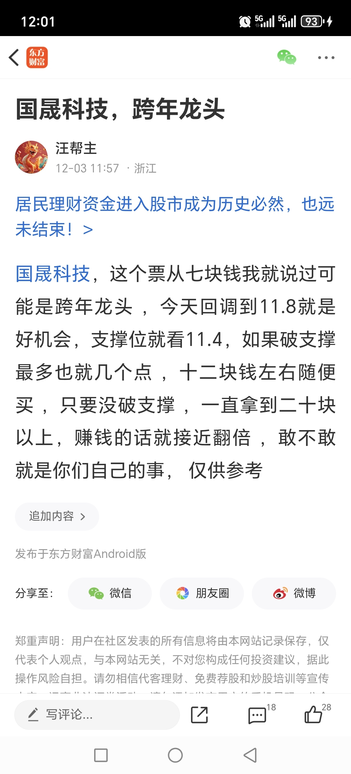 $国晟科技(SH603778)$ 跨年妖,就是他,继续看好 ,坚持之前的观点20以上,从12月3号,当天接近跌停11.8元,发了文章提醒他老铁们 ,十二块钱左右随便买 ,支撑位也说得很清楚 11.4,收盘价从来没有破这个位置,今天接近十六块了 ,预计明天最少16.5以上,仓位重的可以先减一部分出来,降低成本继续格局 ,不接受马后炮 ,只有提前观点,谢谢