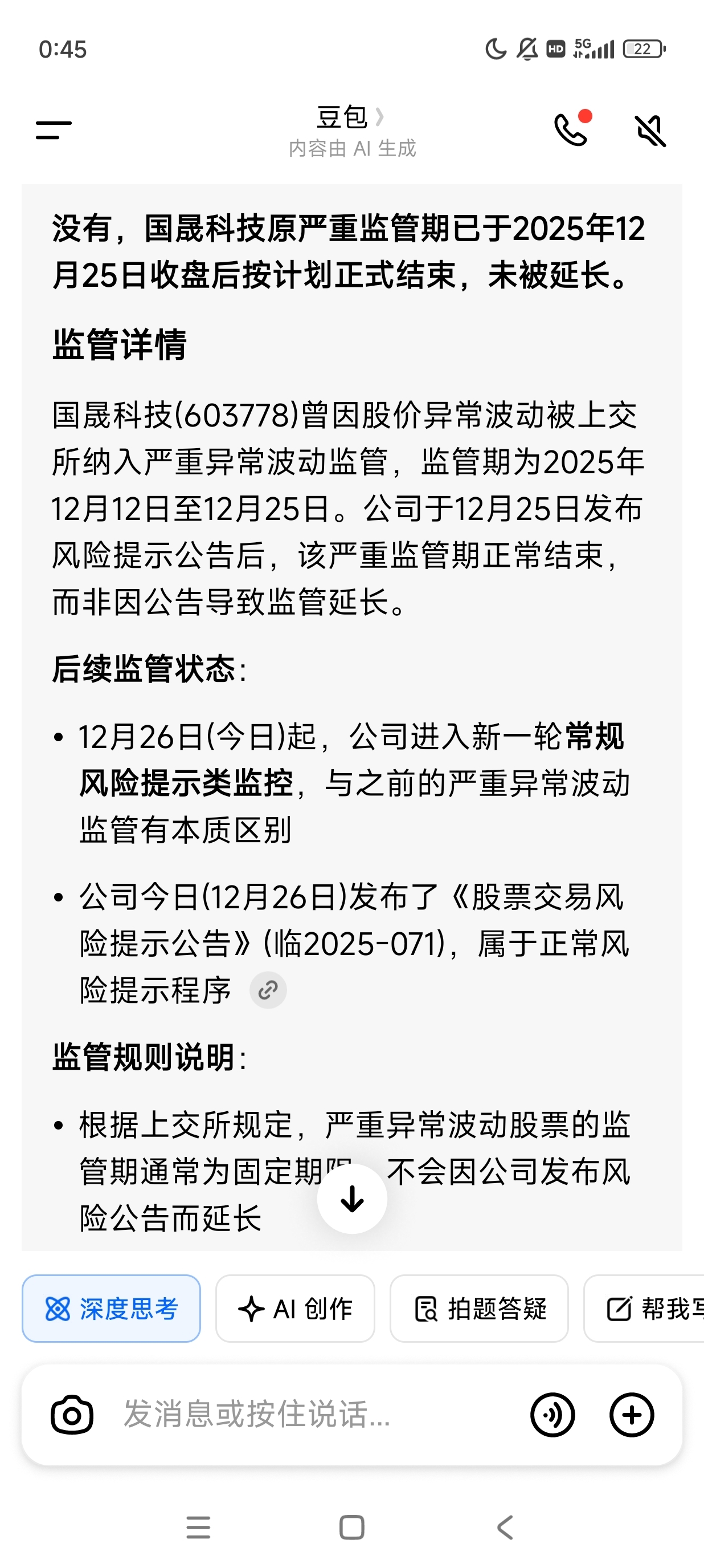 $国晟科技(SH603778)$ 自己去问豆包 豆包说没有延长监管 本质都不一样