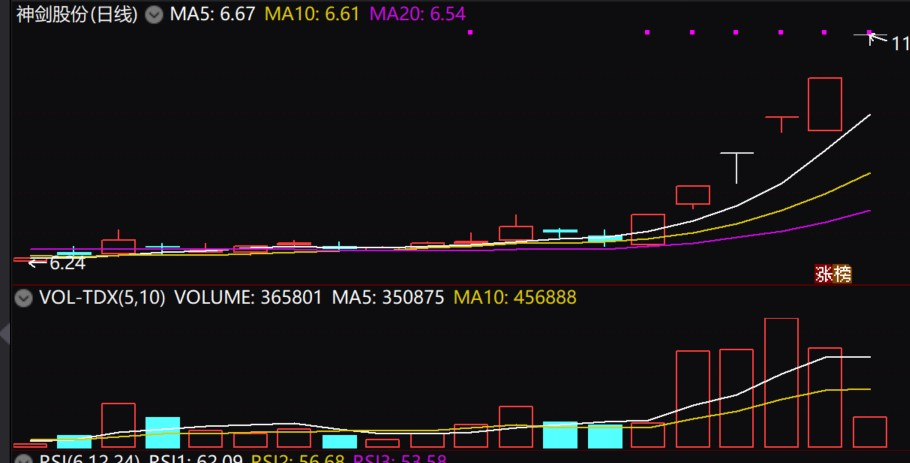 神剑股份公司属于近期市场关注的商业航天、军工、新材料等概念板块。业务直接覆盖“航空、航天及轨道交通”,产品包括磁悬浮列车车体、卫星天线等,全资子公司参与国家星网项目,卫星复合材料零部件已批量供货,实控人已变更为芜湖市国资委,基本面较差,前三季度净利润仅近三千万,净利率低,技术面上昨日受到磁悬浮题材的影响,已经实现6连涨停,昨日缩量涨停做多情绪一致,今日如果高开太多就不考虑,但如果能够高开低走,可以在企稳的时候考虑介入一下。