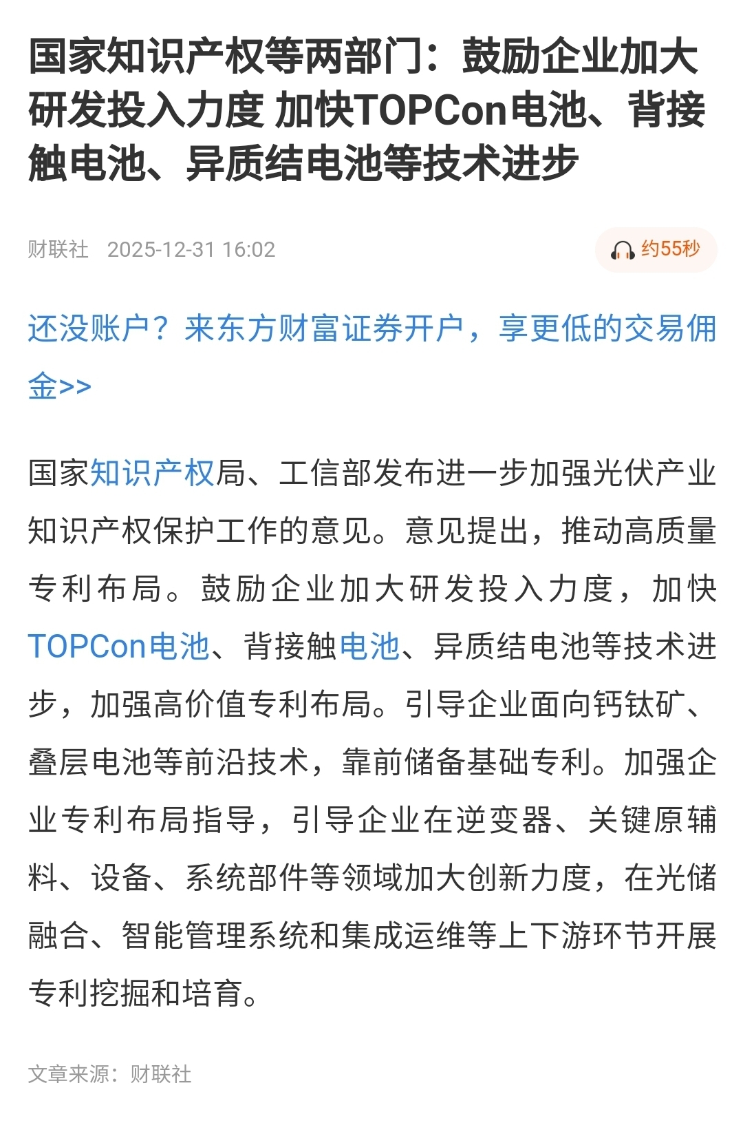 (1) 2025年12月31日盘后消息。国家知识产权局、工信部两部门:鼓励企业加大研发投入力度。加快topcon、背接触、异质结电池等技术进步。引导企业面相钙钛矿、叠层电池等前沿技术。