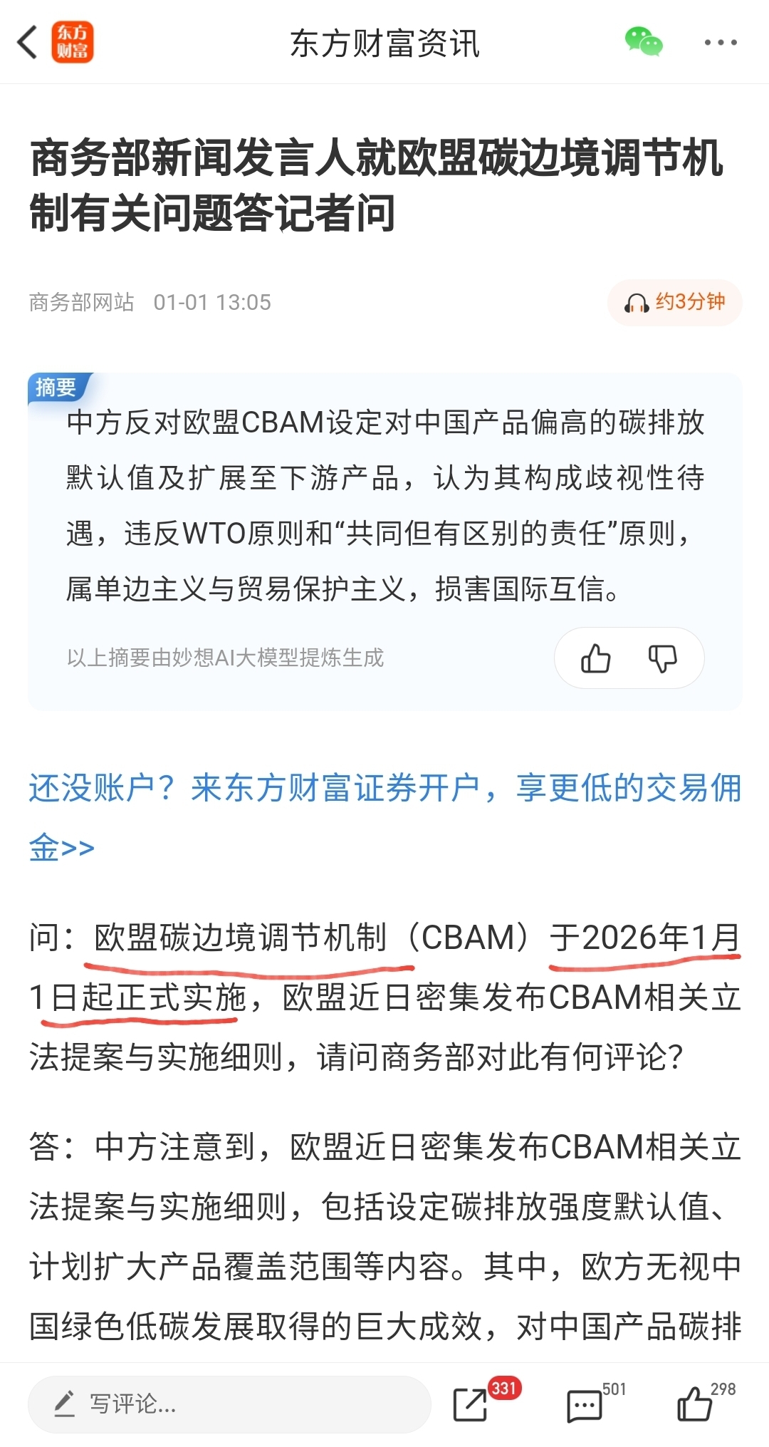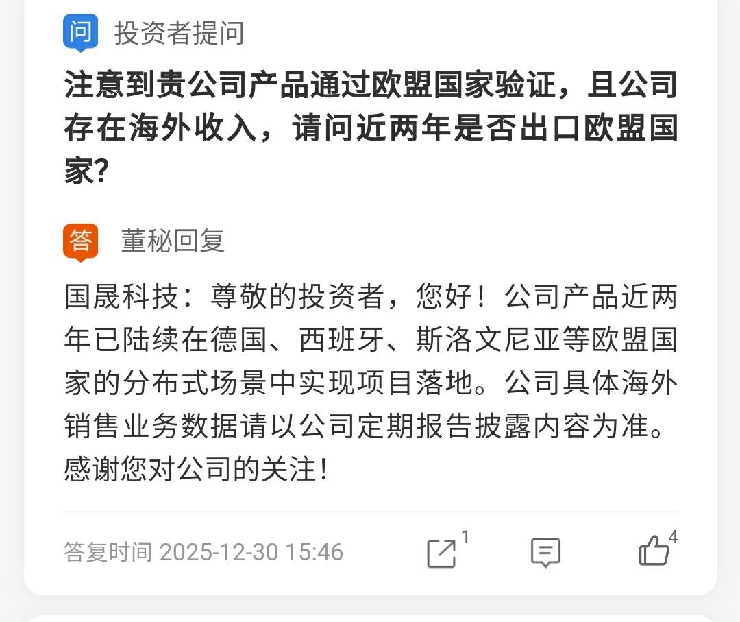 (2) 2025年12月31日盘后消息。欧盟碳边境调节机制于2026年1月1日起正式实施。关于低碳,没有什么比太阳能更低碳的了。董秘2025年12月30日投资者提问中回复“公司产品近两年已陆续在德国、西班牙、斯洛文尼亚等欧盟国家的分布式场景中实现项目落地。”