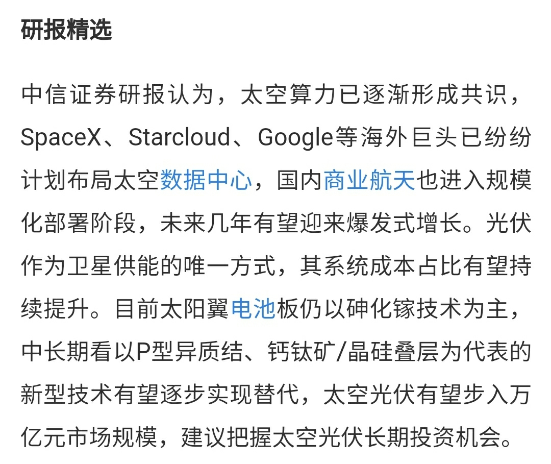 意义:连中信证券这种大块头资金都开始认可太空光伏的万亿市场,那各种机构、基金等中长线大块头资金来异质结钙钛矿叠层龙头国晟科技的时间还远吗?