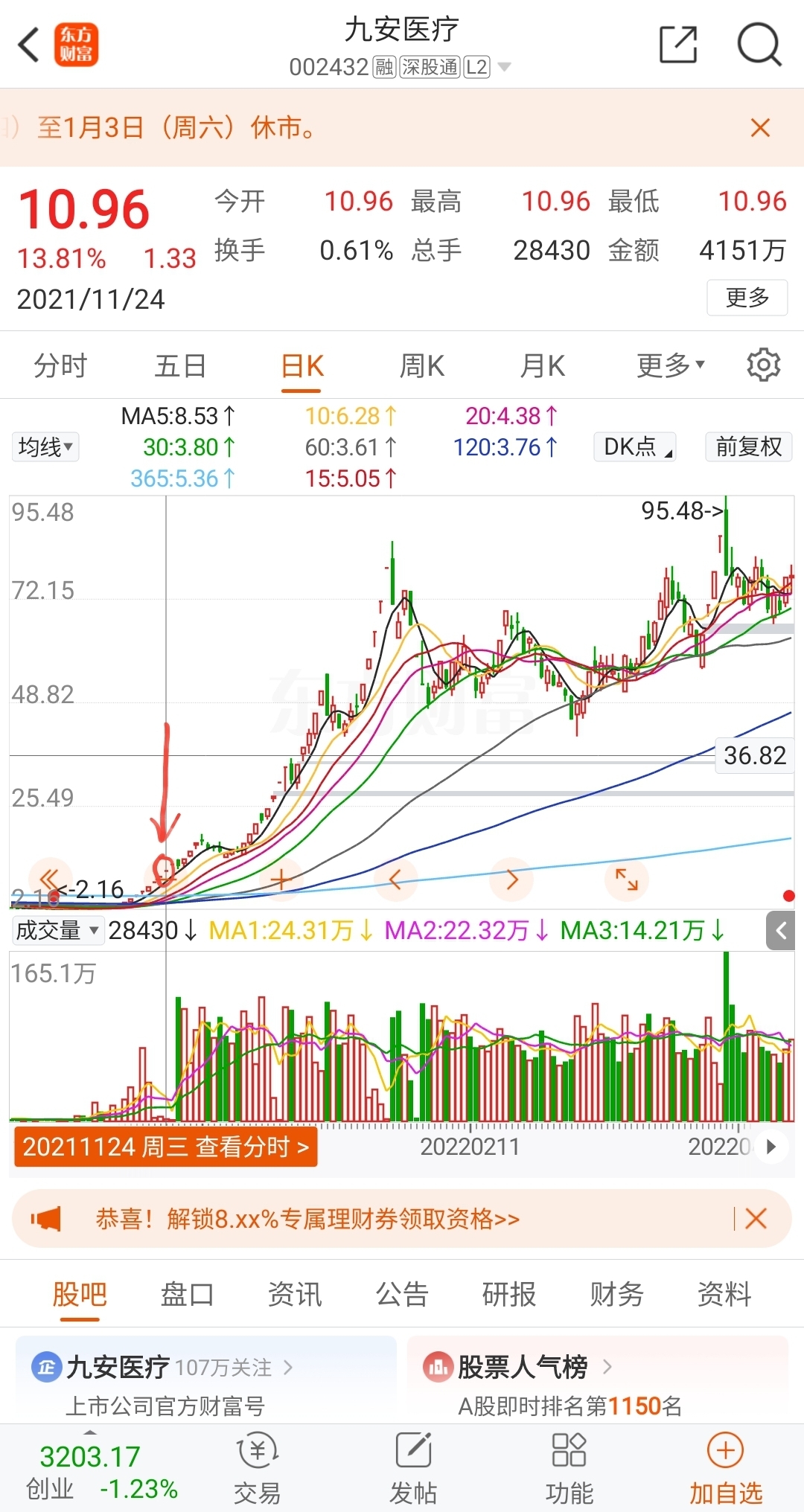 国晟科技2025年12月31日如期反包,形成了多方炮形态,潇洒地完成了跨年动作!而且是大幅缩量,资金共识度非常高。在如此缩量的情况下,完成反包,而且不是涨停,此形态很少见,一般大幅缩量反包,只有可能是在迅速涨停的情况下出现,这已经充分的说明了资金的共识度是非常高的,不然根本办不到。国晟科技现在的形态非常像一个庄股,可以走出任何六亲不认的步伐,未来天空才是尽头。很多人恐高,但我要告诉你的是,淳中科技450亿市值,航天发展530亿市值,他们的质地就一定有国晟科技好吗?国晟科技900亿营收2000亿市值规划不是股东吹的,是董事长计划的。如果你再恐高,我给你看一下九安医疗涨了5倍的位置。你看看那个箭头它的位置高吗?