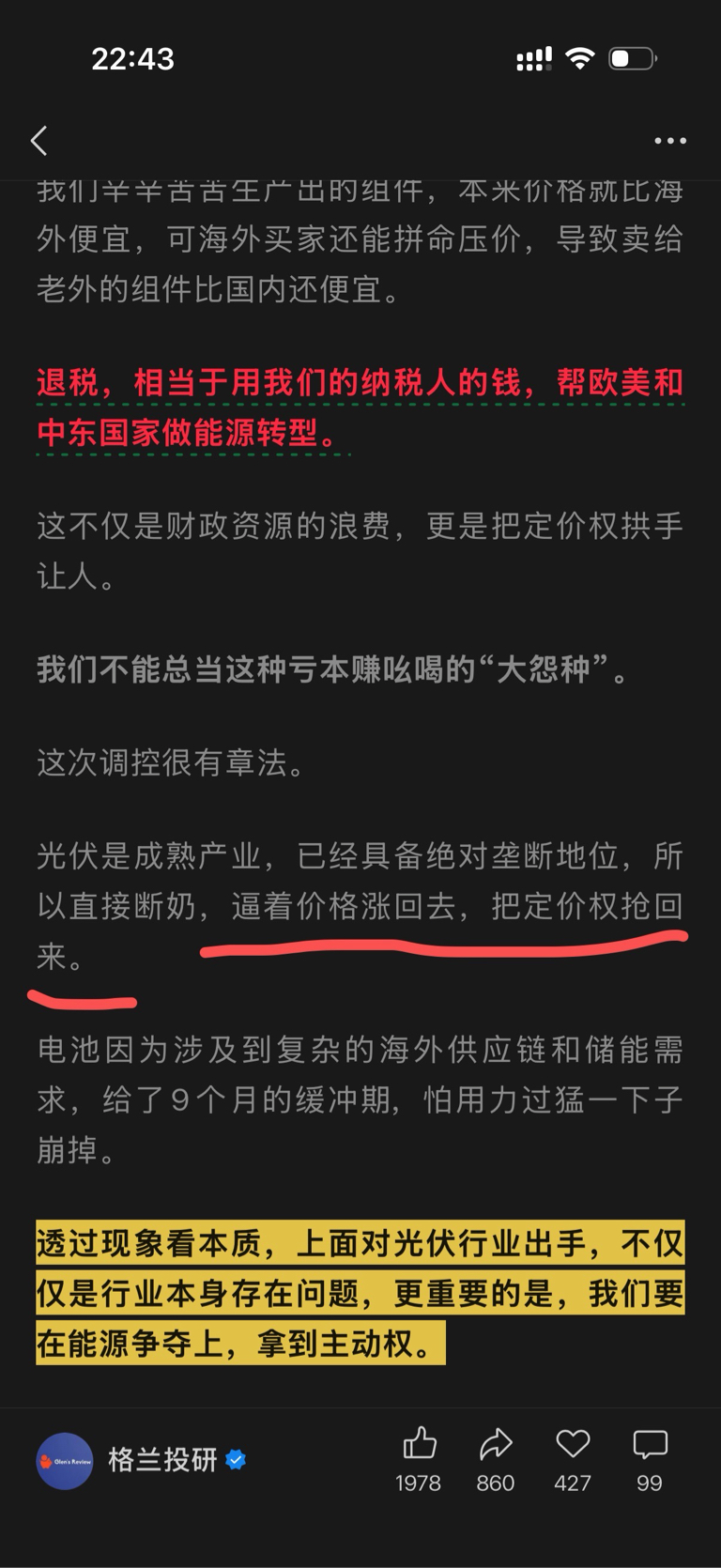 $国晟科技(SH603778)$ 光伏退税是利好还是利空?格老的发言够权威了吧,散户们不明所以,就多看看专业人士的解读吧,别总是被别人骗筹码!