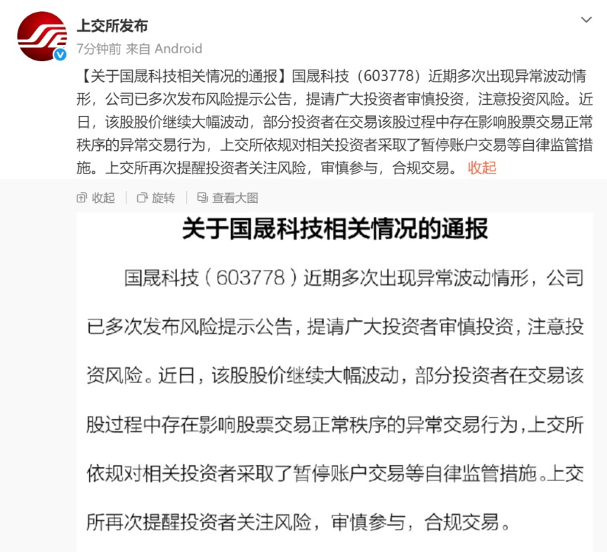 上交所出手了!暂停国晟科技相关投资者账户交易