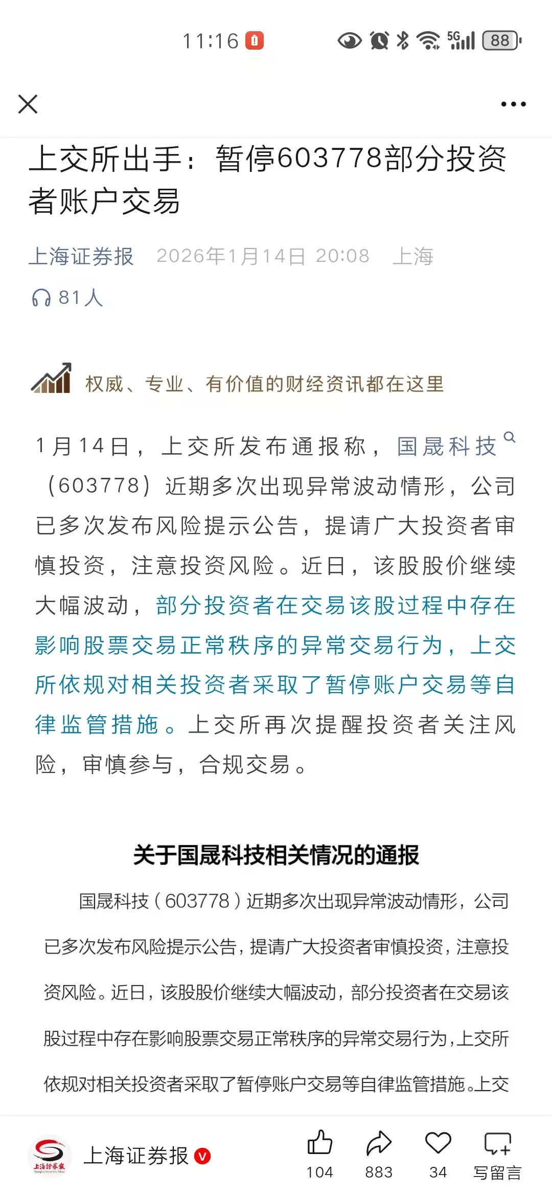 $国晟科技(SH603778)$ 今天被洗出来了,也不知道改说幸运还是不幸运