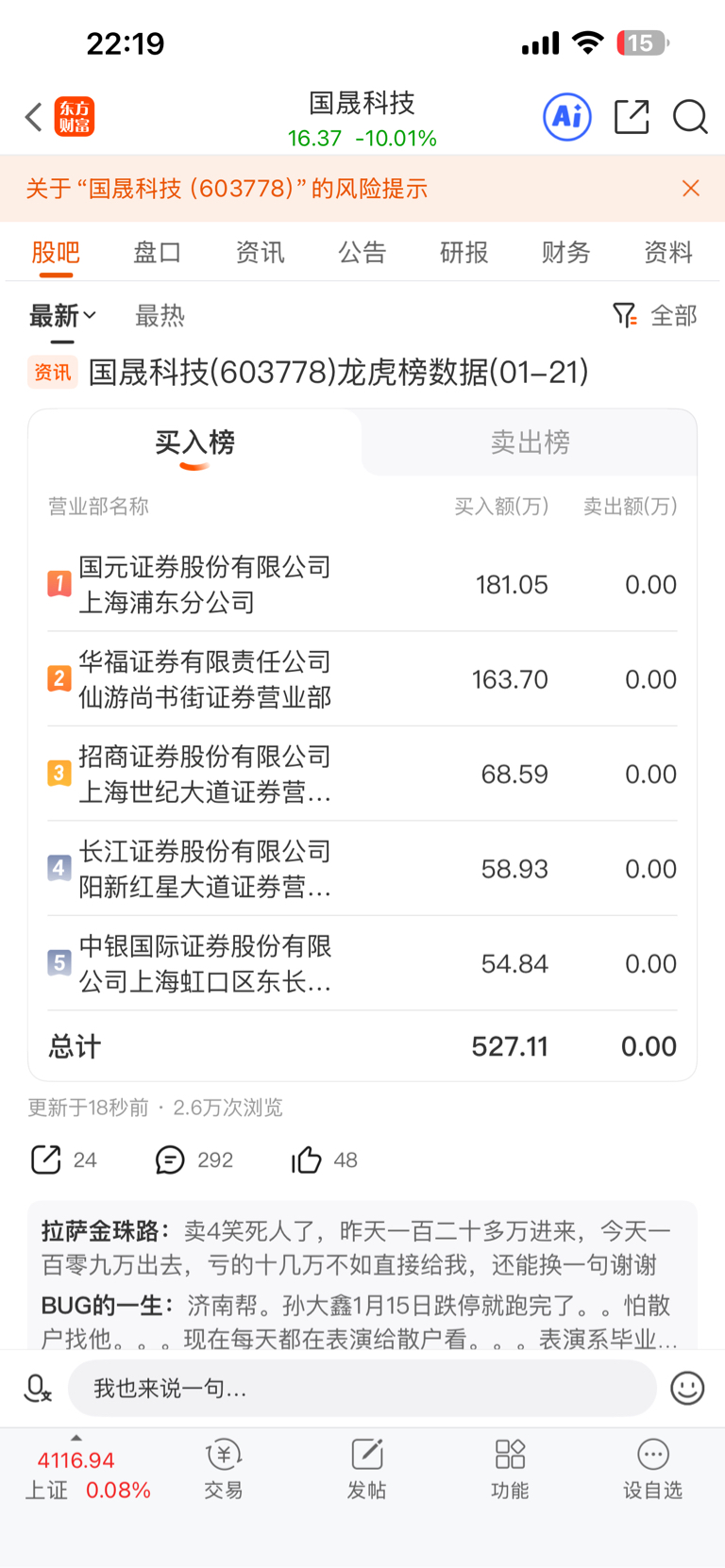 温馨提示: 1.根据《证券法》规定,禁止编造、传播虚假信息或者误导性信息,扰乱证券市场;2.用户在本社区发表的所有资料、言论等仅代表个人观点,与本网站立场无关,不对您构成任何投资建议。用户应基于自己的独立判断,自行决定证券投资并承担相应风险。《东方财富社区管理规定》