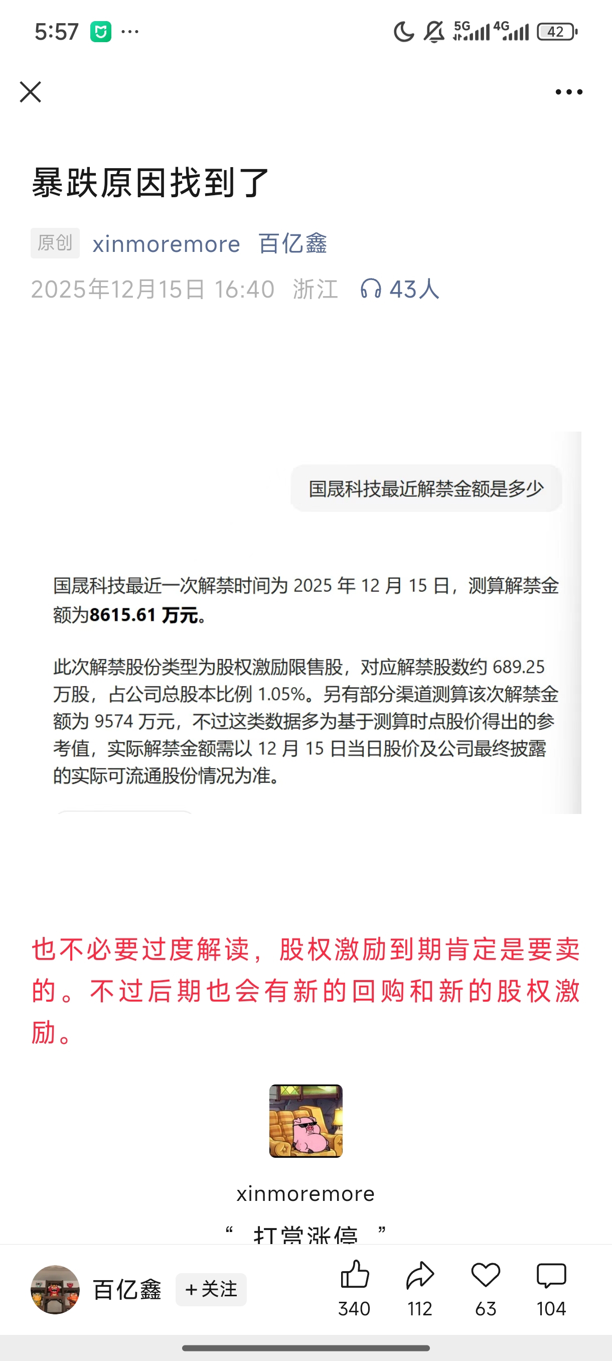 $国晟科技(SH603778)$ 12月严重异动前一天买的,满仓吃了15个点面走了当时不知道鑫多多这回事,看评论区才知道,搜鑫多多看他发文说原因是股权激励解禁导致的,但是公司业绩没达标股权激励根本没达到解禁条件完全是不实消息就割肉走了,后面就走翻倍了然后暴跌。他发的消息看看就得了横向了解其他行业竞争对手,看看国晟几斤几两。