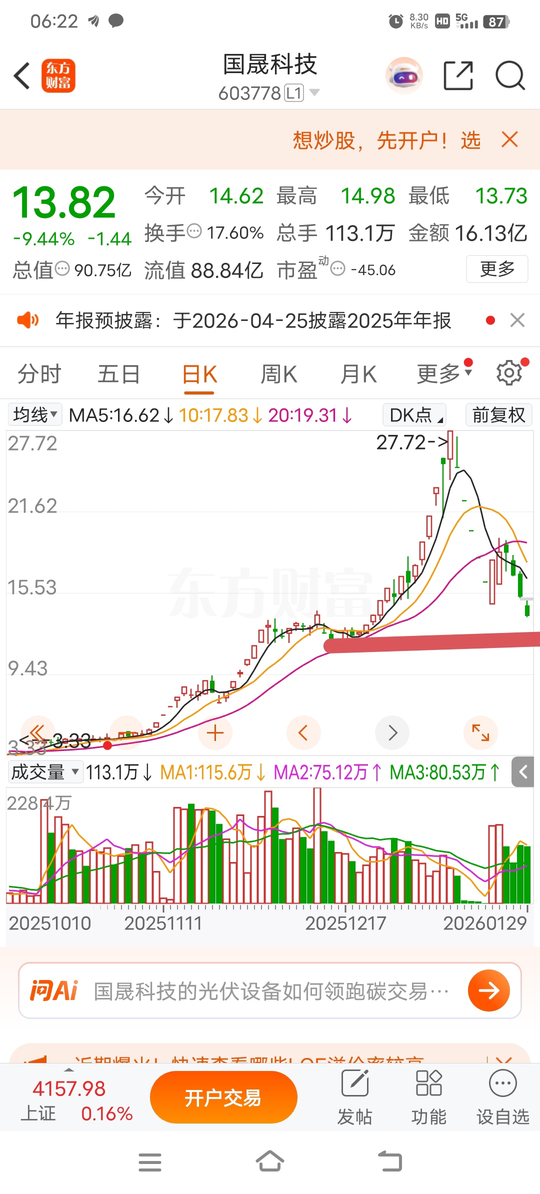 $国晟科技(SH603778)$ 强力支撑位12.6元一一13.00元,看年前行业情况,估计已进入年前整理期,资金收索套现,机构吃肉过年……商业航天暂时结束……白酒消费上席……