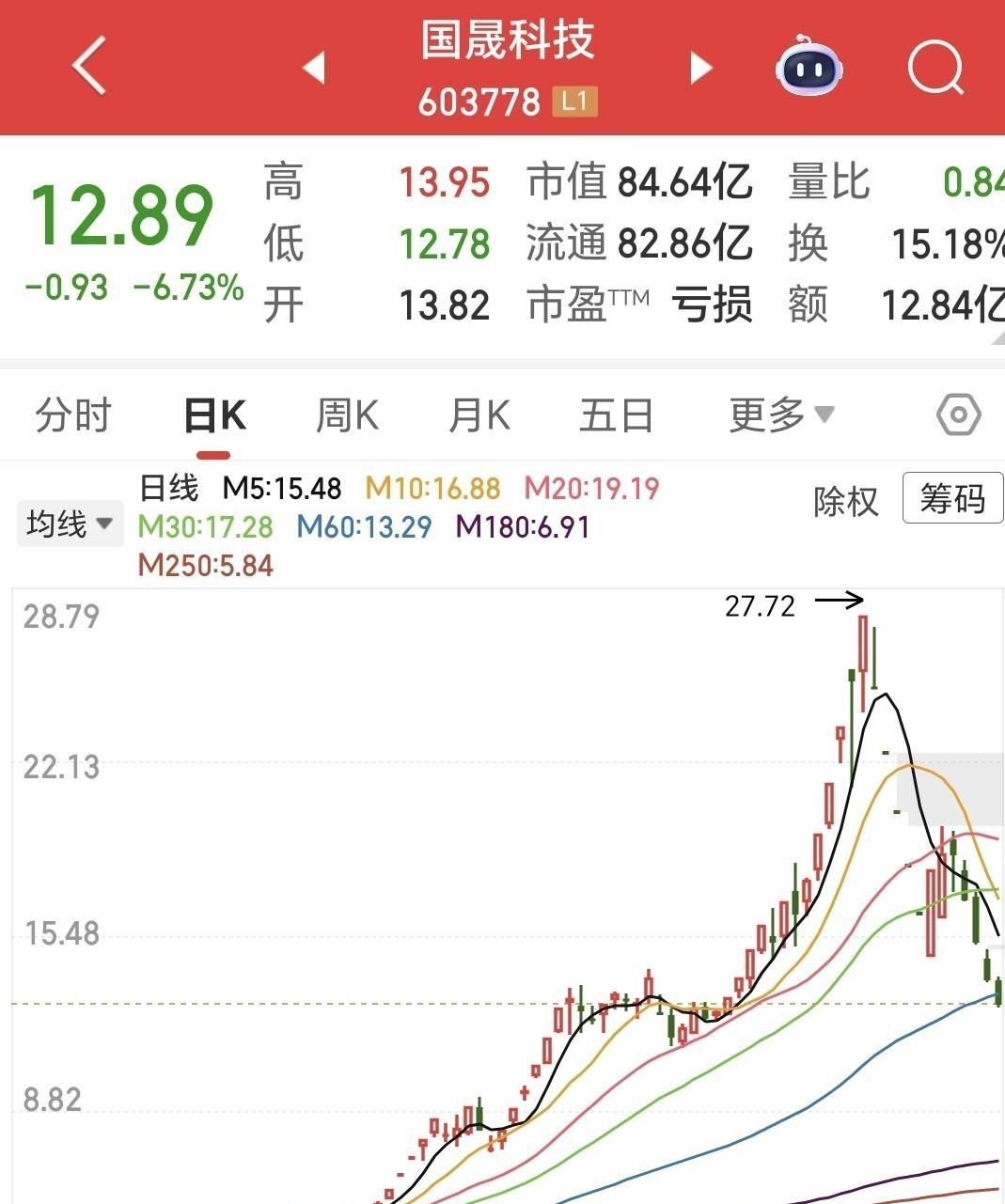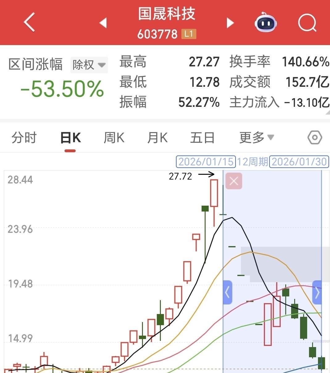 国晟科技股价在1月14日达到狂热顶峰,随后便是断崖式下跌,这正是“从众者往往是赔钱客”的鲜活写照。