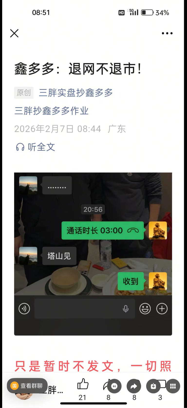郑重声明:用户在财富号/股吧/博客等社区发表的所有信息(包括但不限于文字、视频、音频、数据及图表)仅代表个人观点,与本网站立场无关,不对您构成任何投资建议,据此操作风险自担。请勿相信代客理财、免费荐股和炒股培训等宣传内容,远离非法证券活动。请勿添加发言用户的手机号码、公众号、微博、微信及QQ等信息,谨防上当受骗!