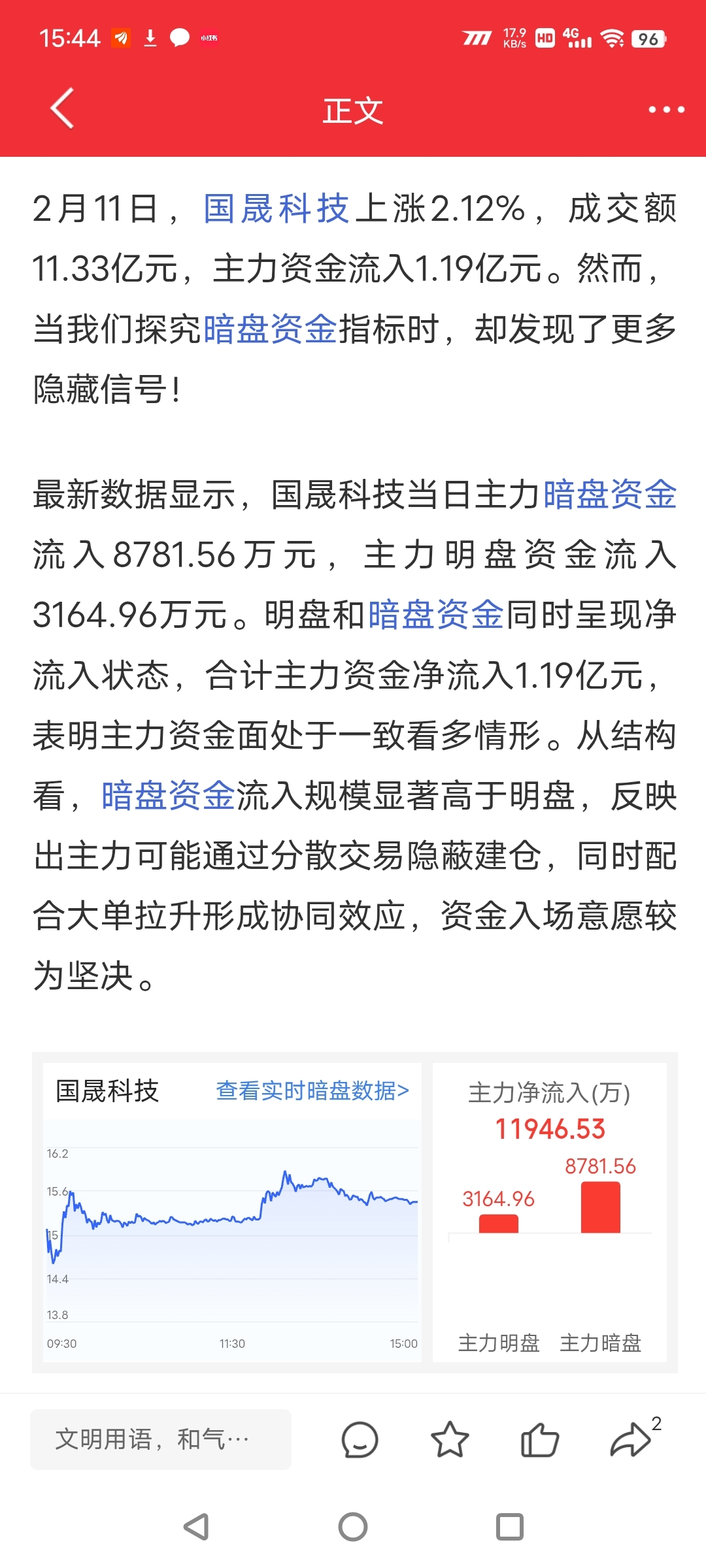 今天国晟科技主力流入1.2亿,暗盘资金