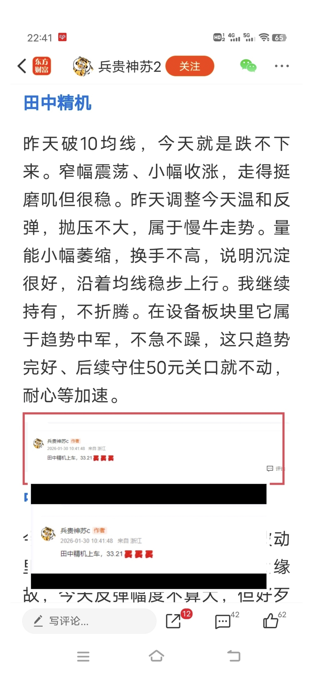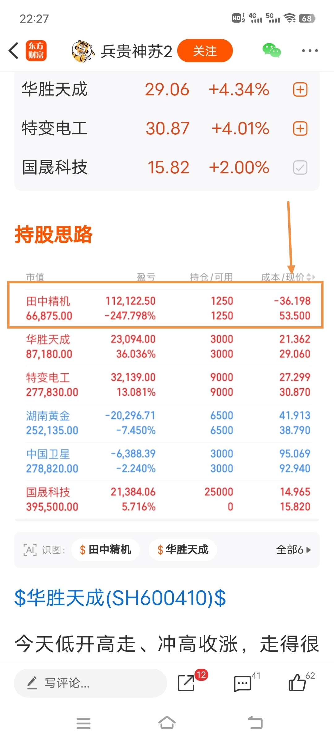 他还发了个截图,说他1月30号33块上的“田中精机”,今天3月4号,中间还过了个年,他就把成本做成了–36了!真的是哭笑不得!你说他不聪明吧,他还知道造假P图沽名钓誉,还有不少人在评论区叫他老师。你说他聪明吧,P个图都能把成本为负的情况下把盈利P成负值。