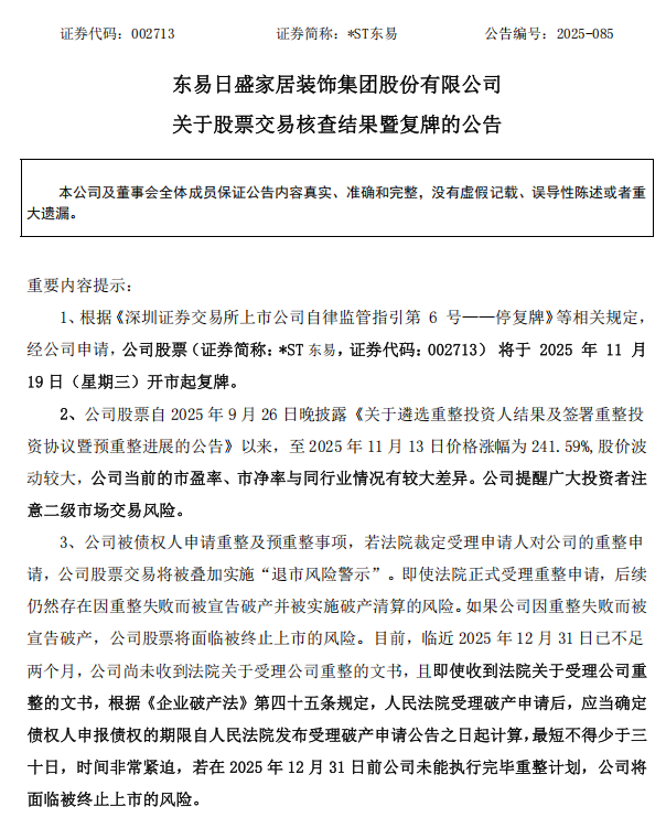 公告显示,公司股票自2025年9月26日晚披露《关于遴选重整投资人结果及签署重整投资协议暨预重整进展的公告》以来,至2025年11月13日价格涨幅为241.59%。为维护投资者利益,公司股票自2025年11月14日开市起停牌核查,于2025年11月19日(星期三)开市起复牌。