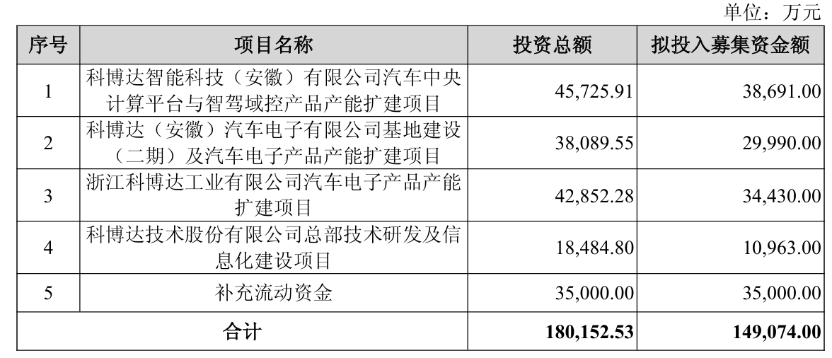 具体来看,3.87亿元募资用于科博达智能科技(安徽)有限公司汽车中央计算平台与智驾域控产品产能扩建;3亿元募资用于科博达(安徽)汽车电子有限公司基地二期建设及汽车电子产品产能扩建;浙江科博达工业有限公司汽车电子产品产能扩建项目投入3.44亿元;科博达技术股份有限公司总部技术研发及信息化建设项目投入1.1亿元。