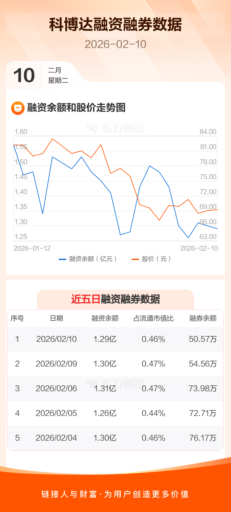 交易所最新数据显示,科博达于2026年2月10日获融资买入401.64万元,融资偿还537.81万元,当日融资净偿还136.17万元。目前,该股融资余额1.29亿,占流通市值比例为0.46%。