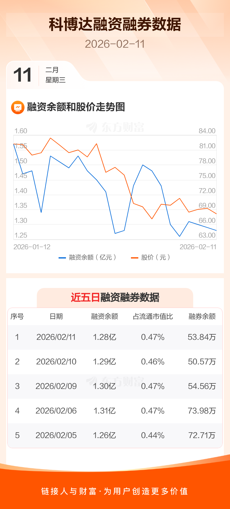 交易所最新数据显示,科博达于2026年2月11日获融资买入605.88万元,融资偿还673.64万元,当日融资净偿还67.76万元。目前,该股融资余额1.28亿,占流通市值比例为0.47%。