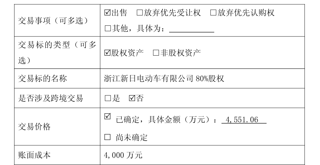 新日股份表示,经双方协商一致,确定股权转让价款为人民币4551.06万元。本次交易完成后,浙江新日将不再纳入公司合并报表。