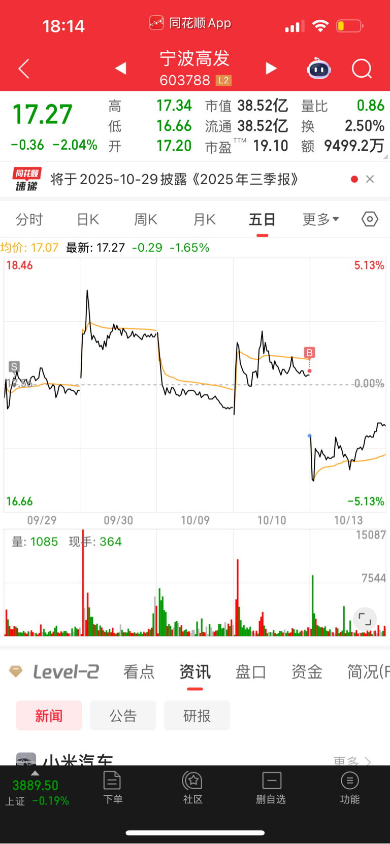 $宁波高发(SH603788)$ 上周5尾盘买入想搏短的,开盘斩仓出局,继续观注