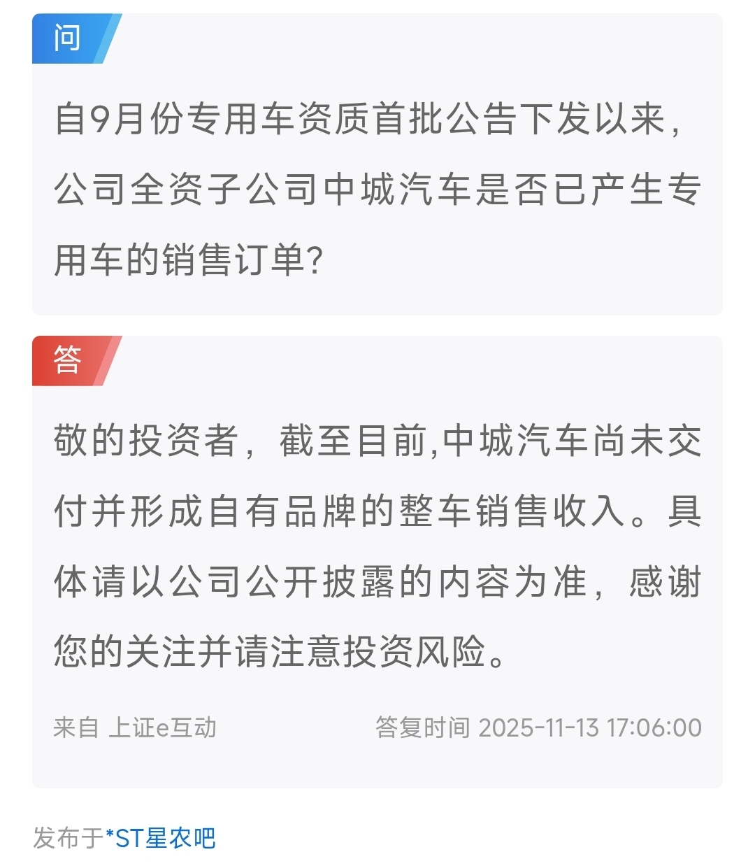 $*ST星农(SH603789)$ 很好,董秘的回答完全印证了老王的猜想。专用车即将起飞。