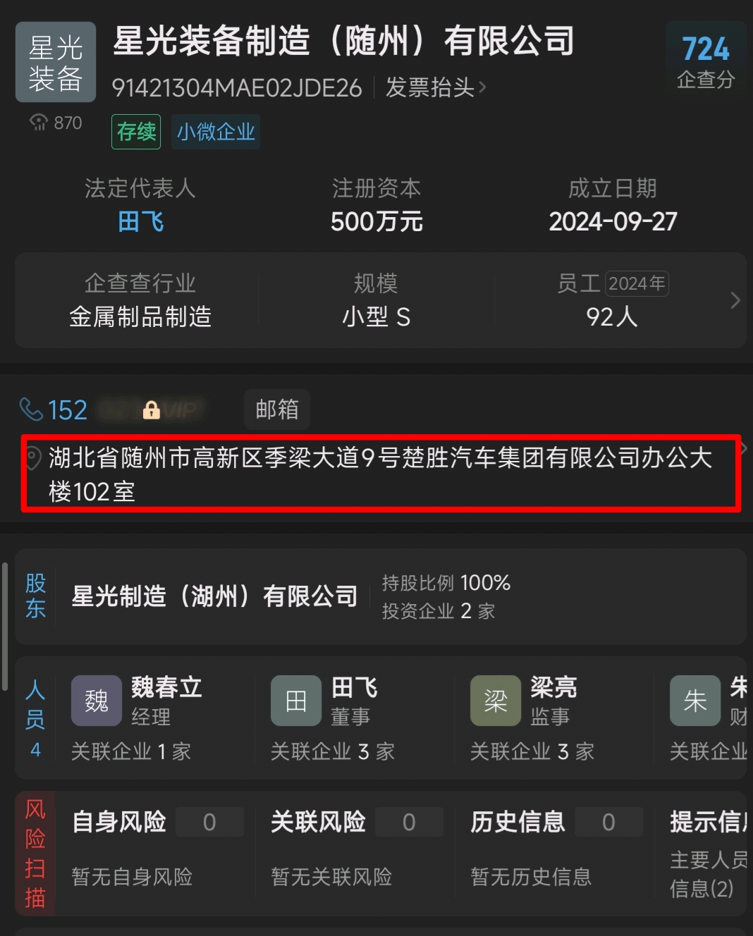 2024年开始布局汽车配件了,直接在楚胜汽车集团开设公司了。