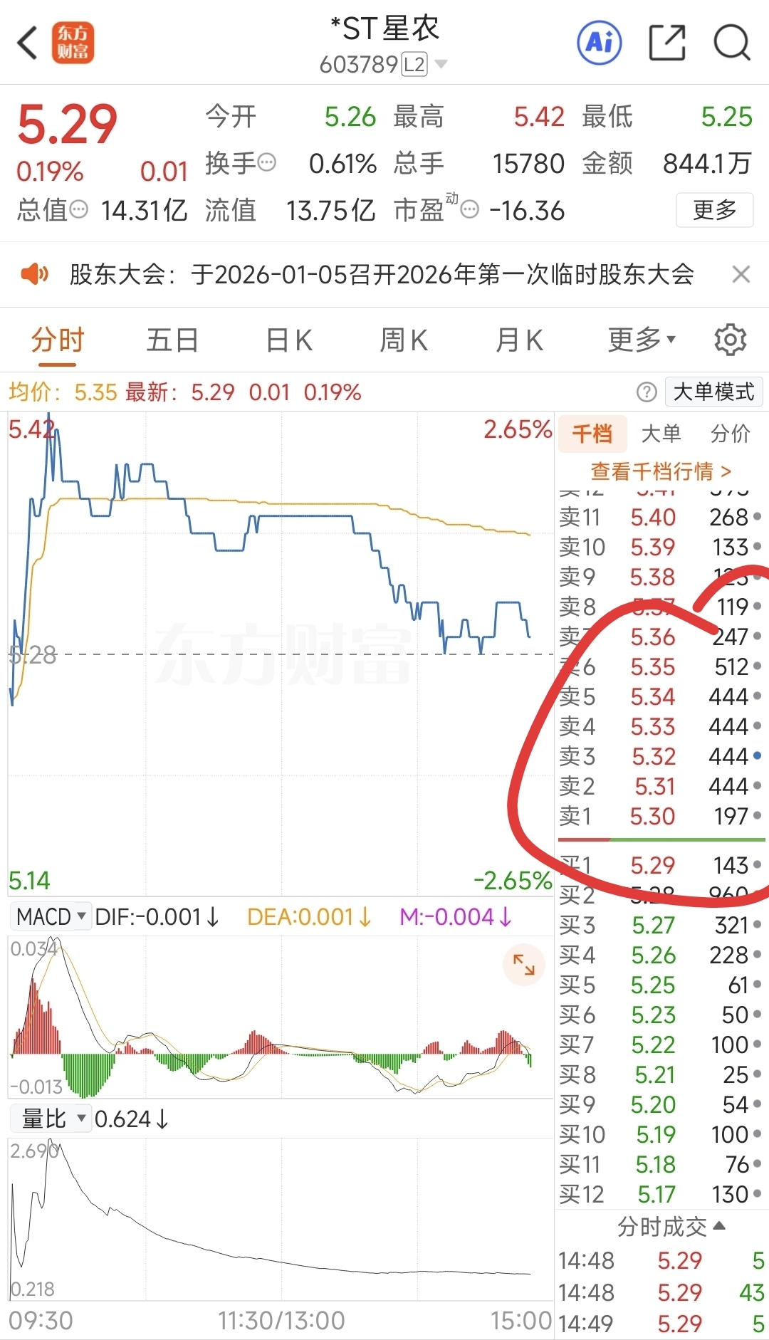 $*ST星农(SH603789)$ 盘口语言来了,提醒要出事