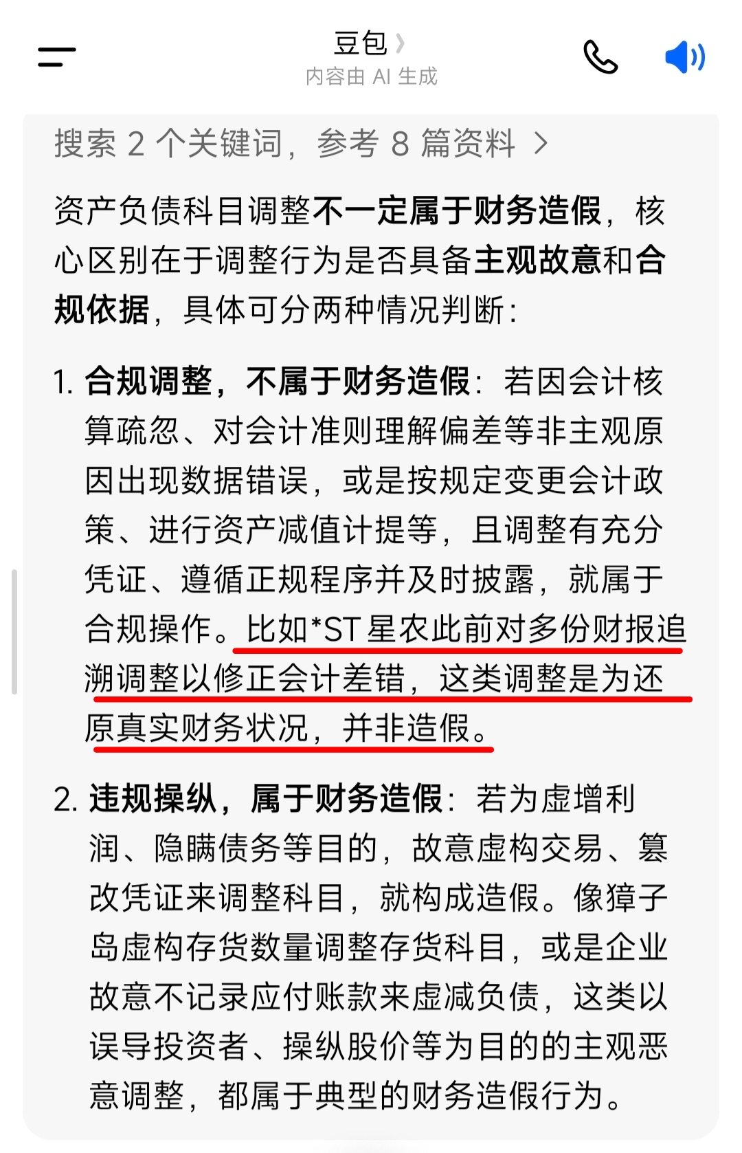 豆包说资产负债科目调整不一定属于财务造假,估计找个财务负责人背锅。