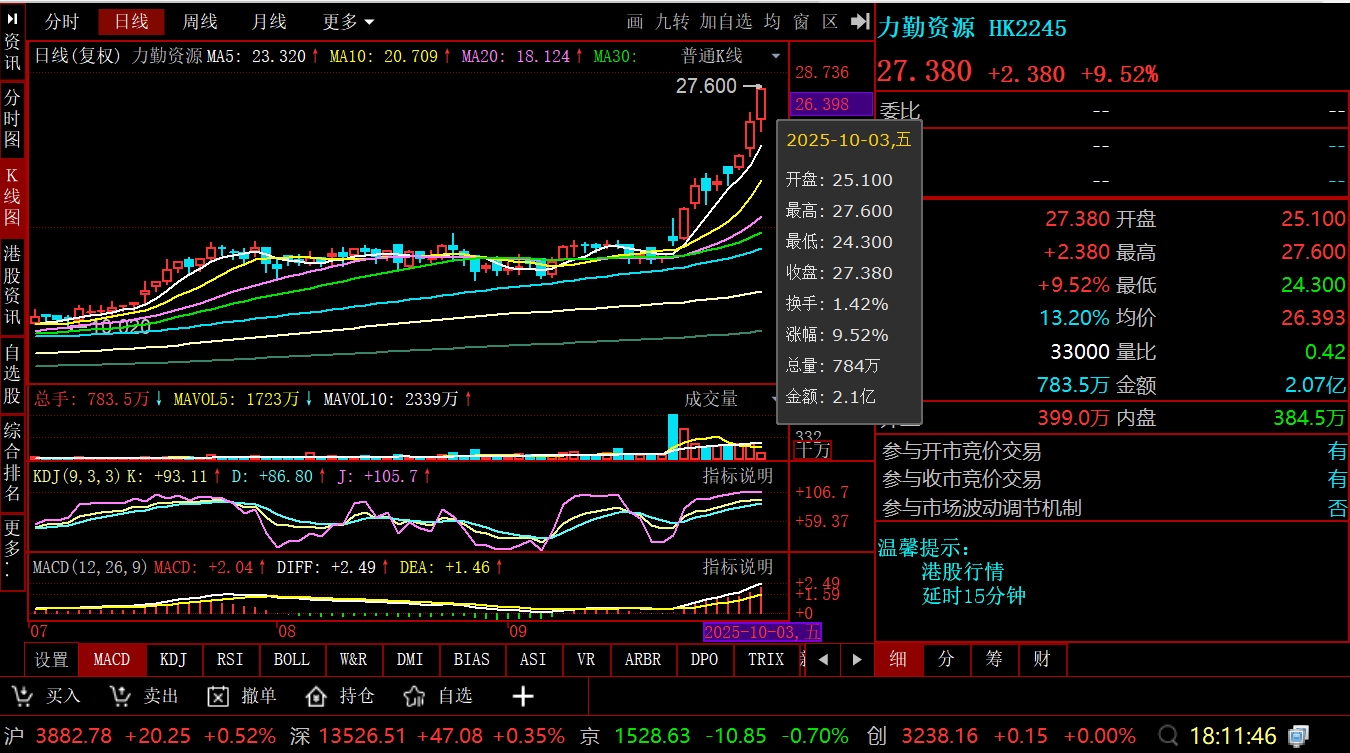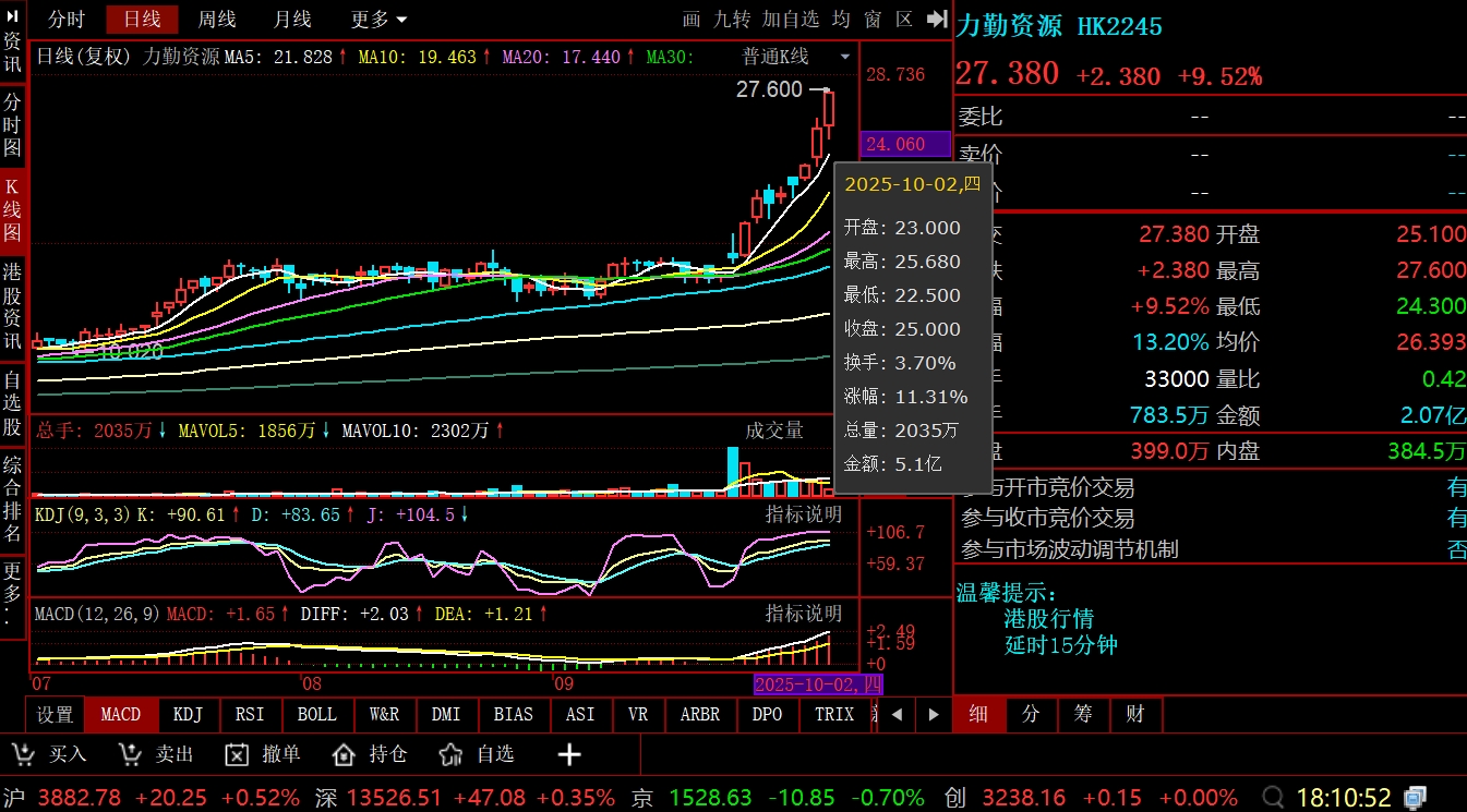 港股镍股力勤资源10月2日涨11.31%、3日以涨9.52%