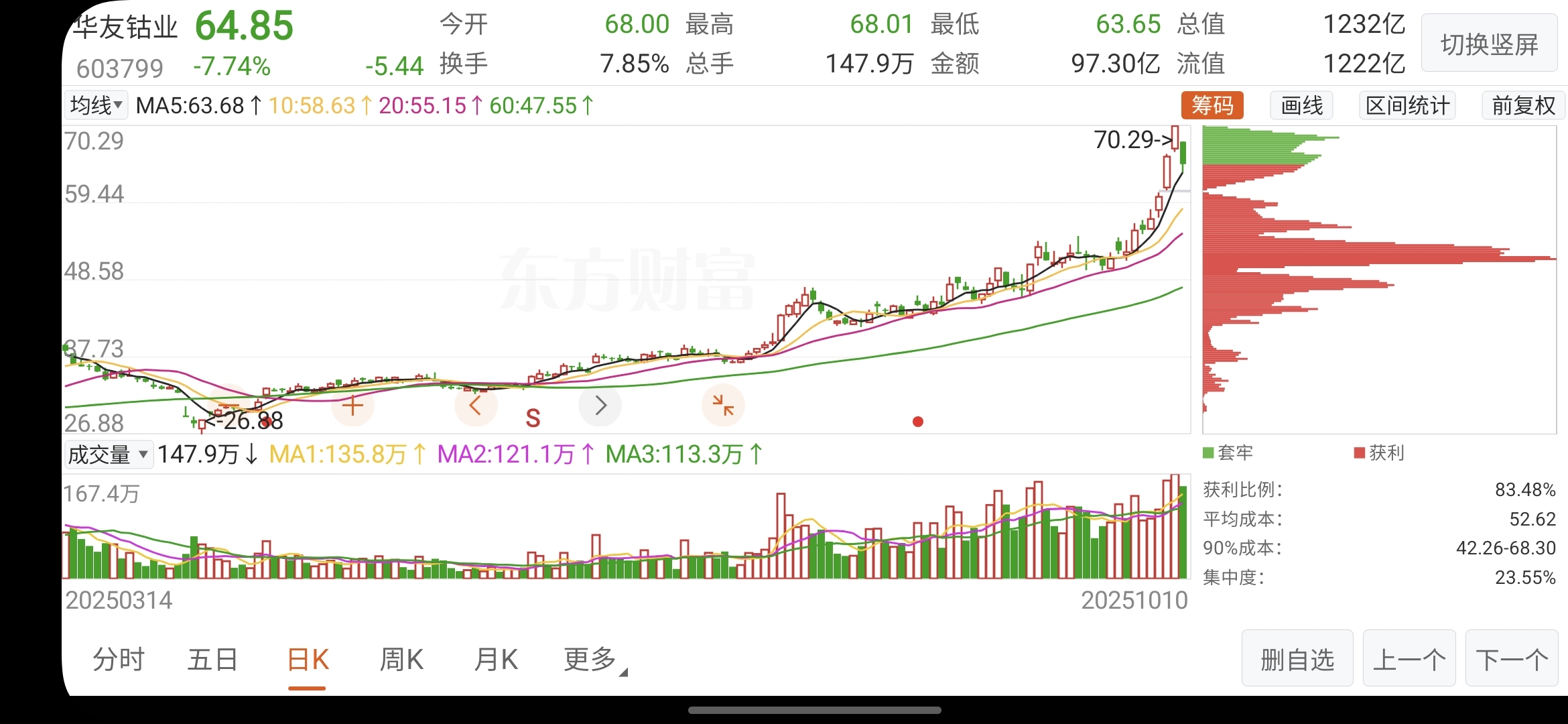$华友钴业(SH603799)$ 很多白吃不知道业绩好钴价涨,为何股价还暴跌。根本不知道股价涨跌的根本原因。看看筹码从40到60多么厚的获利盘,其中50亿融资仓周一还不跑?昨天抄底的山顶套盘不割肉?周一要是抄底的也吓不出手,那就是缩量一字跌停板!这一波起码杀3个月,洗到40附近,套牢与获利筹码出清集中在40到45附近,换手低于1%,人气跌出4000,几个十字星打底才算干净!半年别碰他。