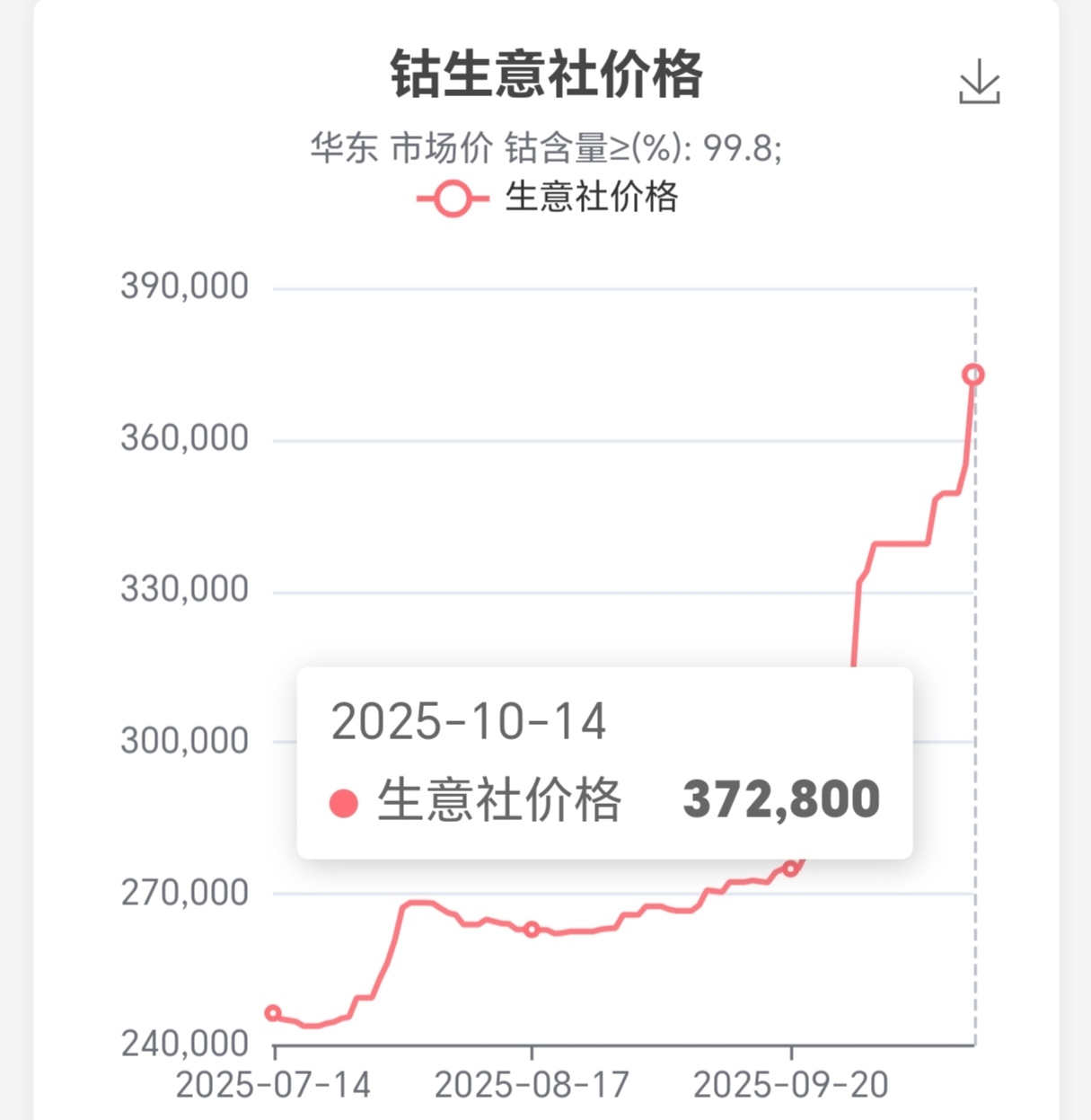 钴金属价格,今天37.28万元/吨,本周45万元/吨预期中,未来钴金属价格50万元/吨一定要突破的,并且长期化,因为钴金属长期供不应求。