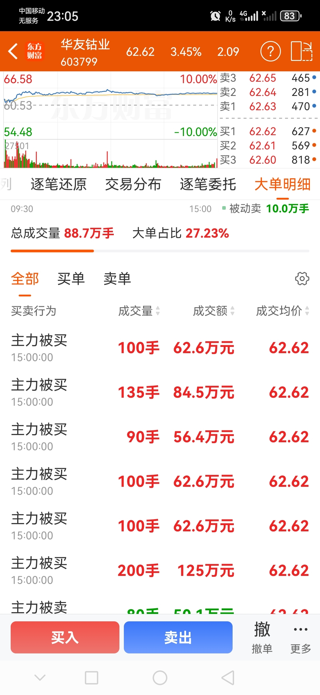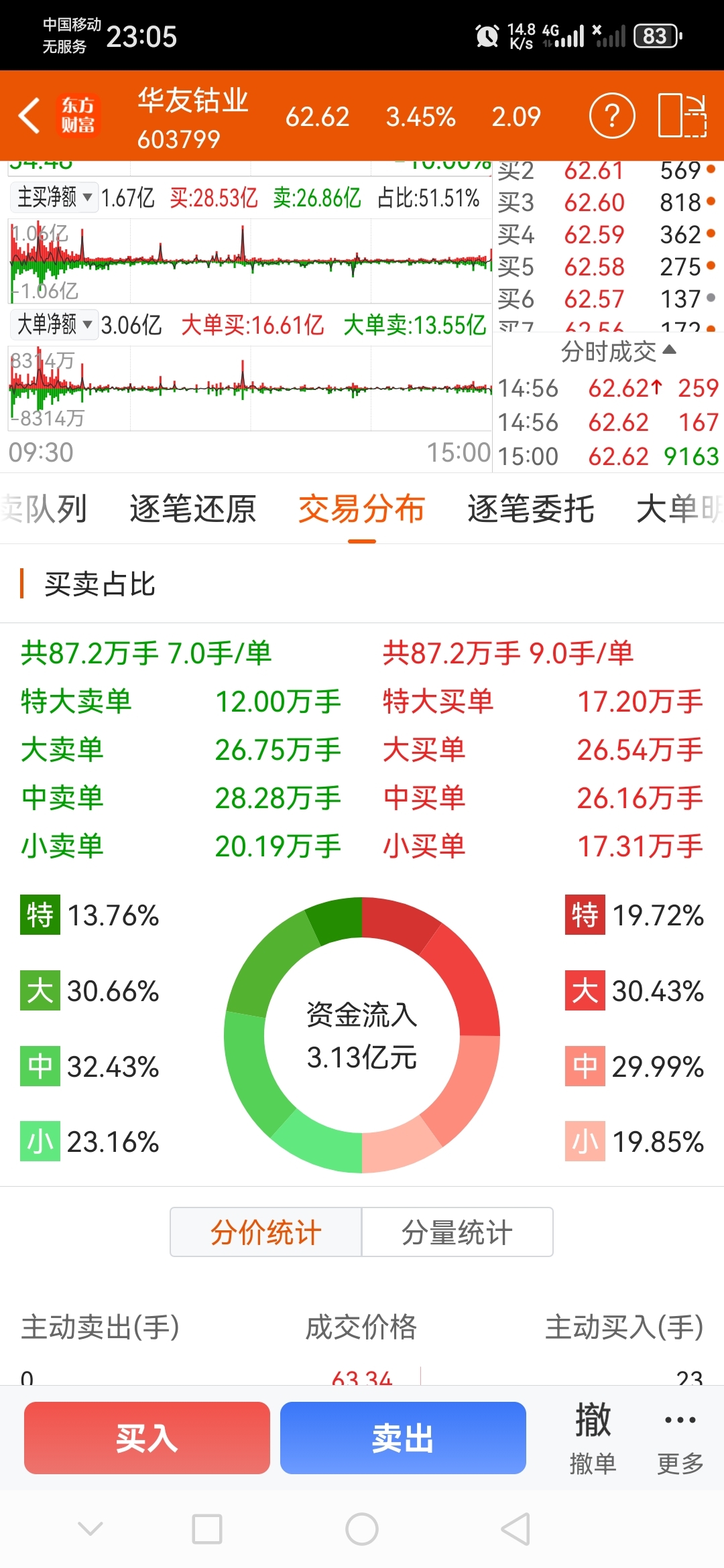 15:00进了几百手大单,今天资金流入几个亿才涨几个点。明天能不能上65啊!