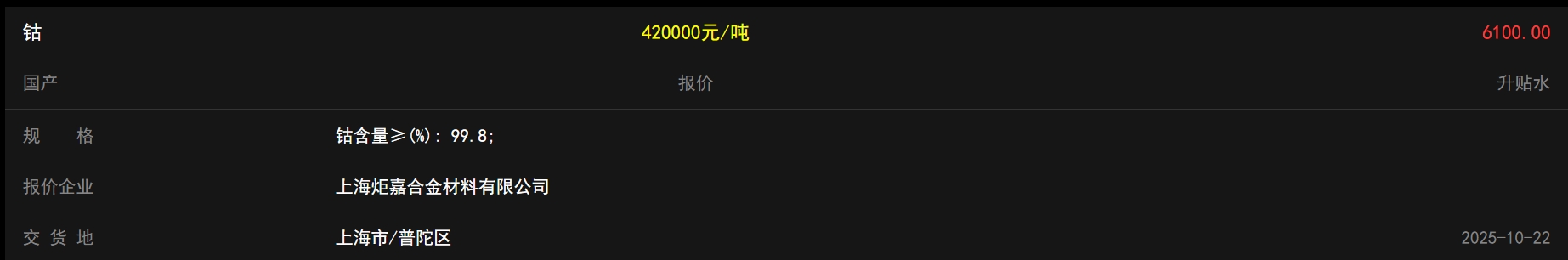 今天上海炬嘉钴报价继续上涨6100元至42万