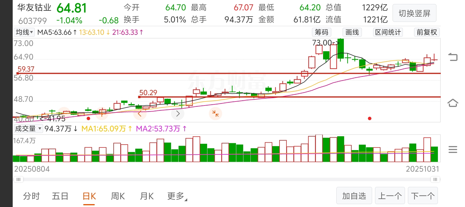 $华友钴业(SH603799)$ 短线博弈,有资金流入迹象,仓位10%。波段上,仍然采取谨慎态势,若回调至下方支撑位,加仓10%。共20%仓位即可。若10%仓位尚在,以持有为主,不可随意增减。