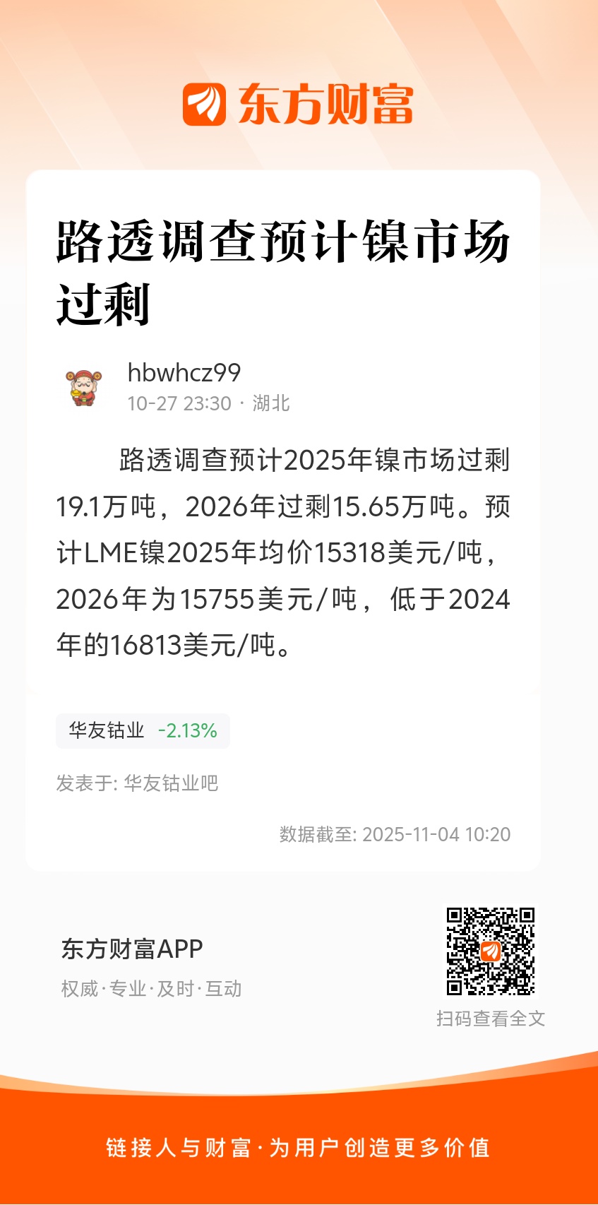 路透调查预计2025年镍市场过剩19.1万吨,2026年过剩15.65万吨。预计LME镍2025年均价15318美元/吨,2026年为15755美元/吨,低于2024年的16813美元/吨。