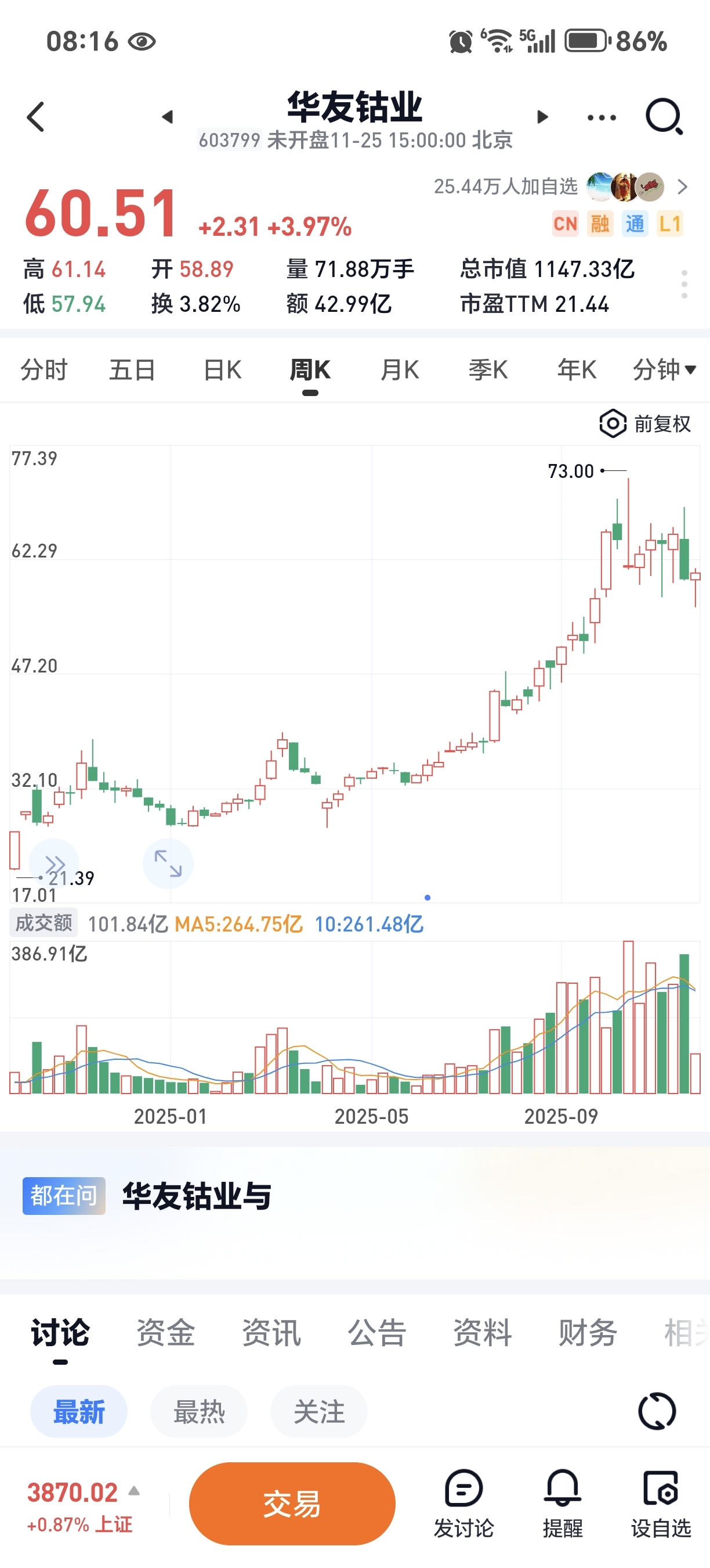 这周还有3个交易日,距离前期高点73还有21%的空间,借着昨天公布的重大销售合同