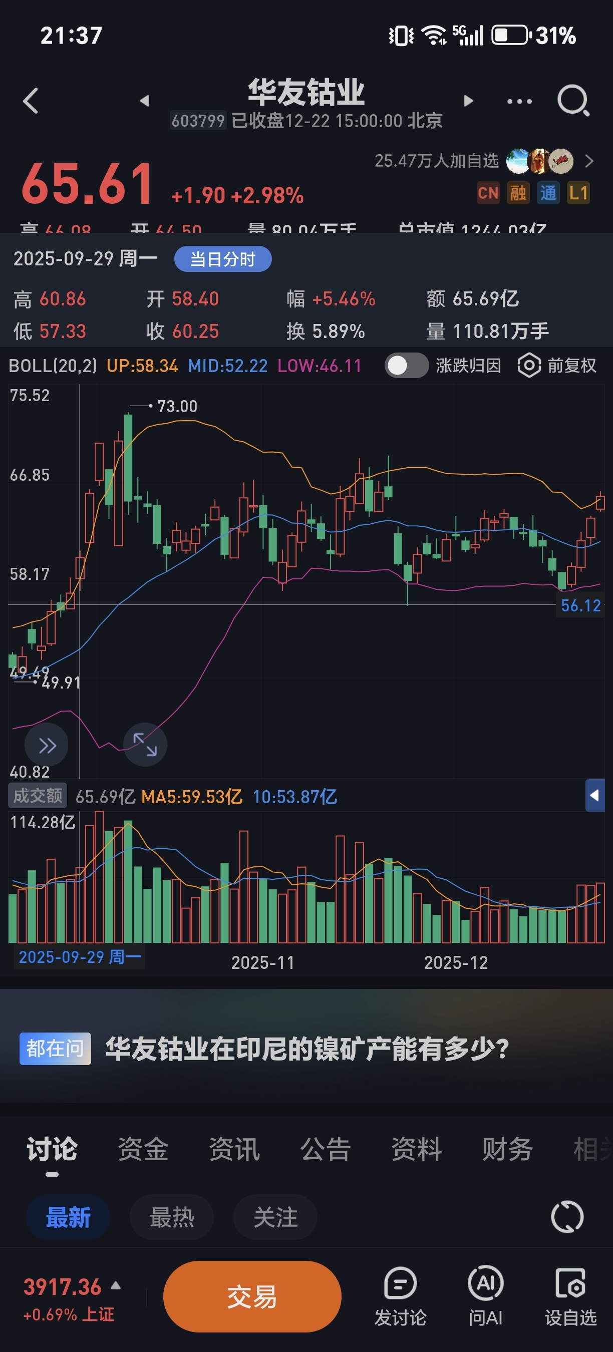 $华友钴业(SH603799)$ 接下来的3天,能不能模仿9月29日开始连续3天的强势上涨,3天大涨23%呢?65.61×1.23=80.7 抄送$天齐锂业(SZ002466)$ $赣锋锂业(SZ002460)$ 宁德时代 寒武纪 亿纬锂能 工业富联 中国电信