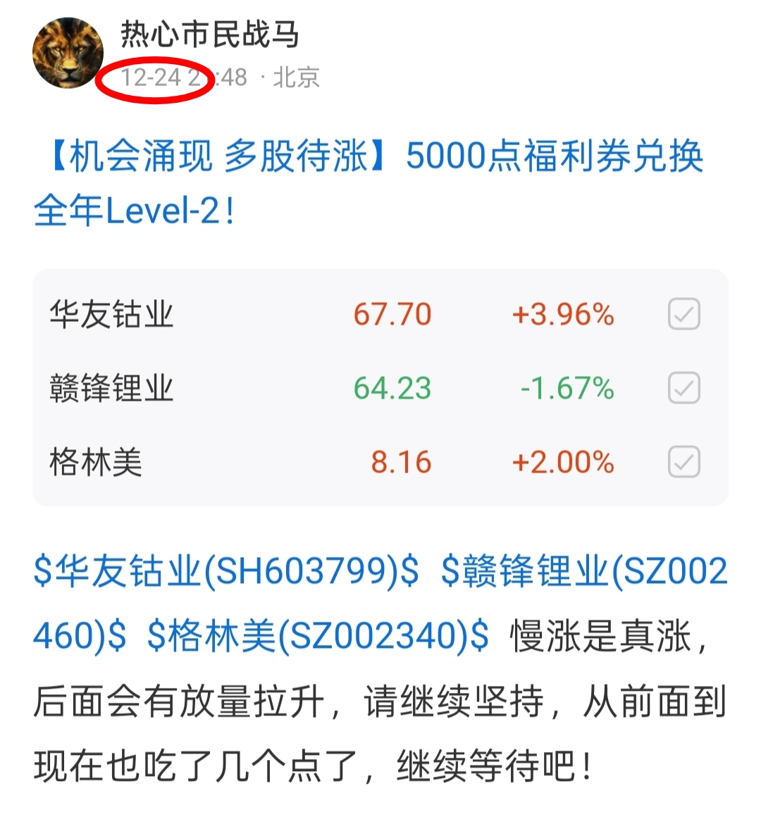 $华友钴业(SH603799)$ $格林美(SZ002340)$ 趋势只在耐心之中,波动是正常的,你需要的是足够的毅力。$赣锋锂业(SZ002460)$ 只是短暂的情绪利空,趋势不会变。
