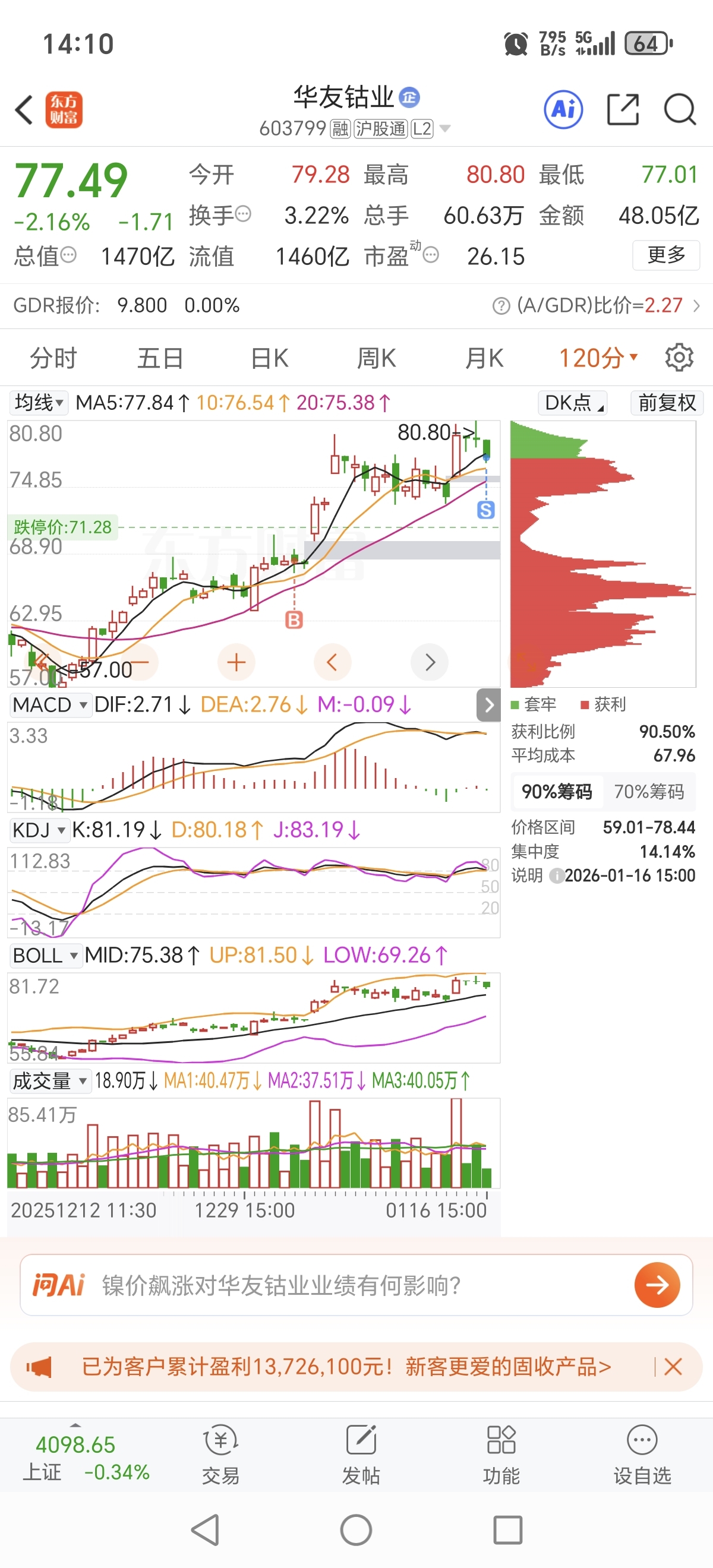 $华友钴业(SH603799)$ 调整是少不了了,120分钟顶背离,