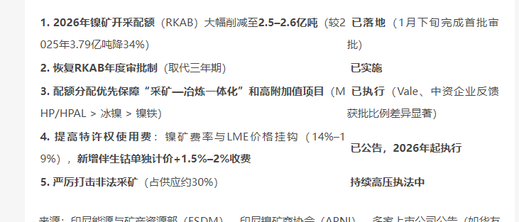 截至2026年2月1日,印尼政府关于镍金属的“核心政策”已正式落地并进入执行阶段
