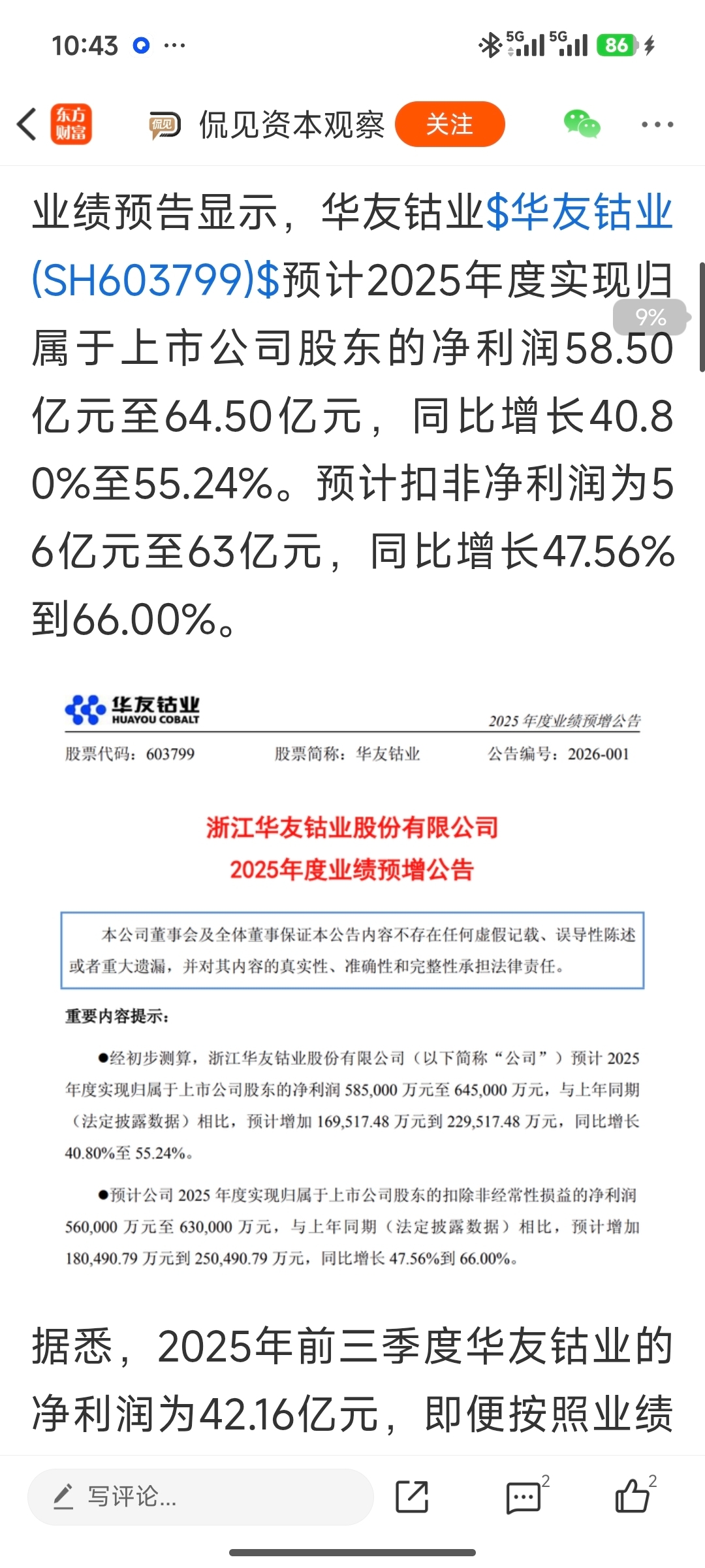 $华友钴业(SH603799)$ 这个是东方财富上面的新闻,业绩这么亮眼,你还天天跌,连个有色的平均数都没涨到
