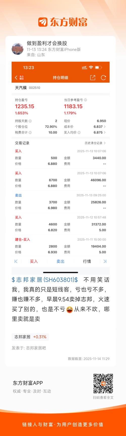 $志邦家居(SH603801)$ 不用笑话我,我真的只是短线客,亏也亏不多,赚也赚不多,早晨9.54卖掉志邦,火速买了别的,也是不亏