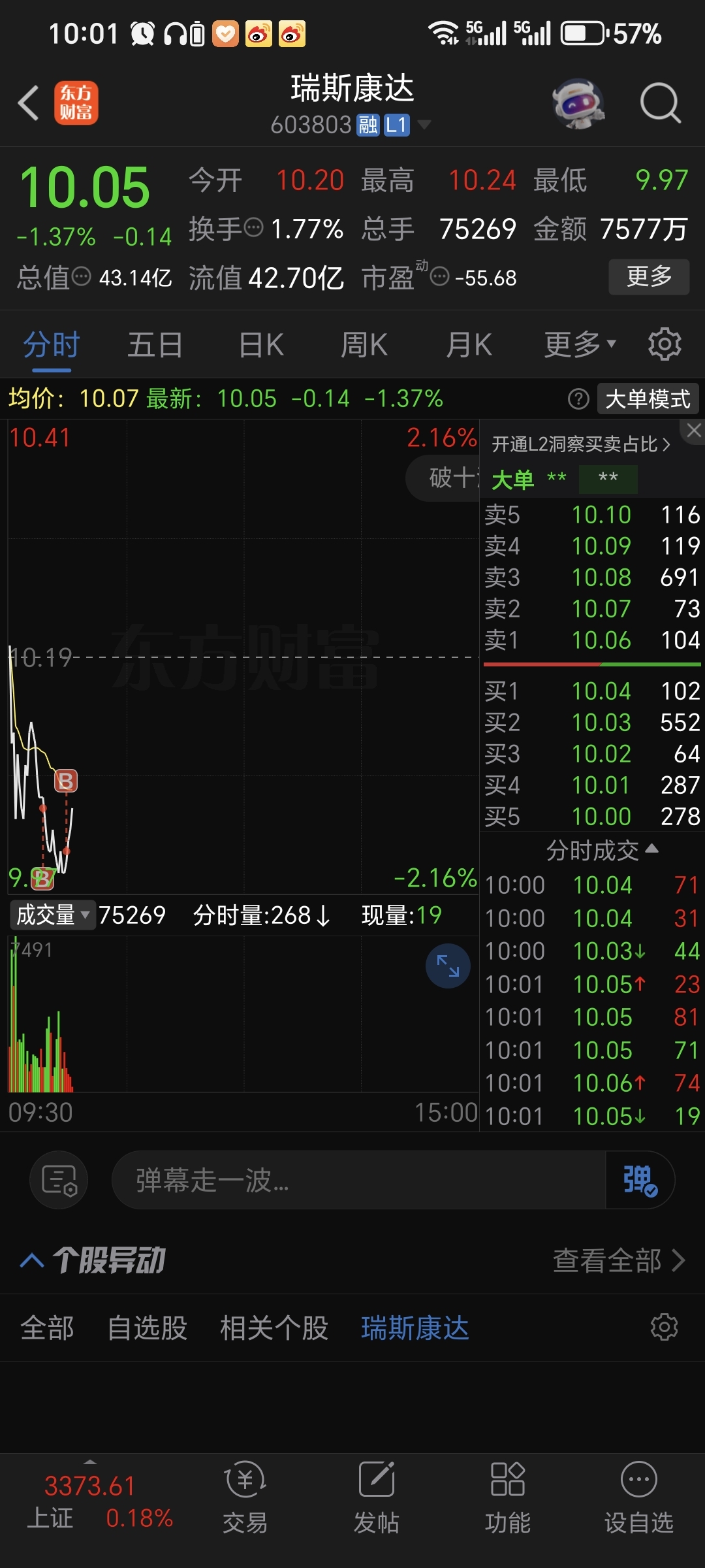$瑞斯康达(SH603803)$ 加仓等会如果冲高继续做T!