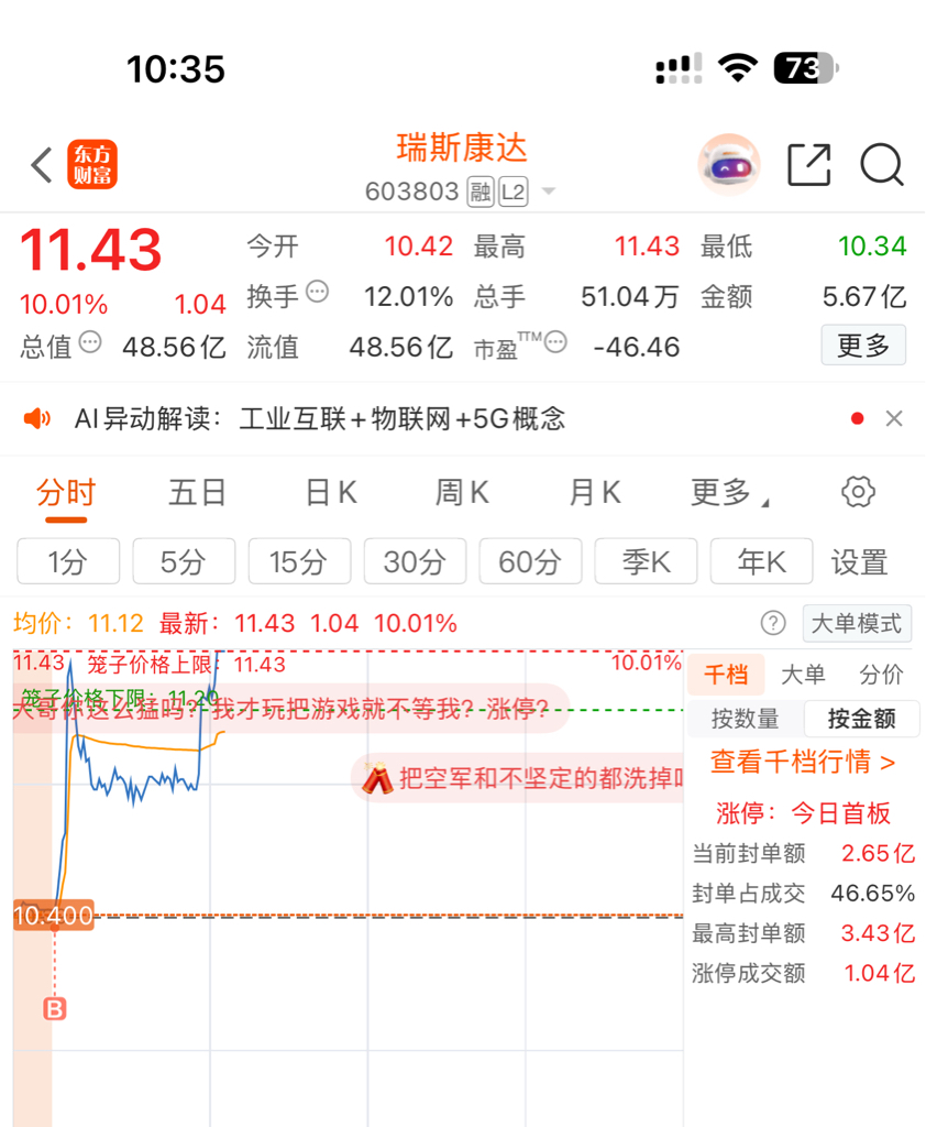$瑞斯康达(SH603803)$ 好消息是买了,坏消息是只买了一手,涨的出其不意,真是
